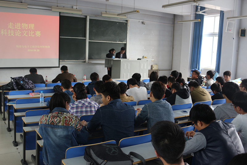 为了进一步激发我校学生崇尚科学、追求真知的精神,营造校园科技学术氛围,提高大学生的综合素质,4月28日物理与电子工程学院“走进物理”科技论文竞赛决赛环节在东一楼318教室和300教室同时举行。本次活动以培养学生的创新精神和实践能力为重点,以追求真理、弘扬科学精神为主题。经过初赛选拔,全校共12组同学进入决赛。