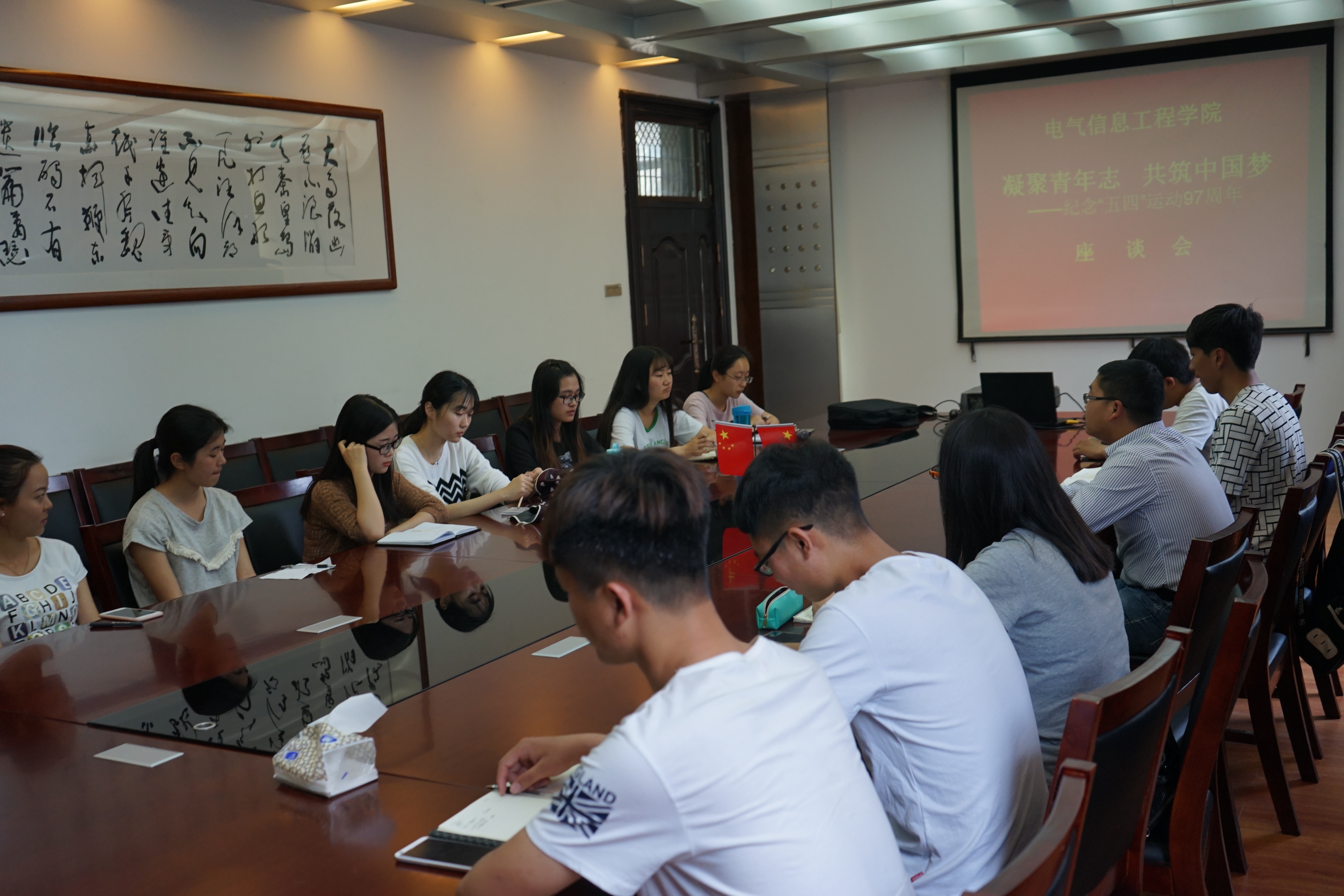 5月4日13:00,电气信息工程学院在西二楼301室召开纪念五四运动97周年座谈会。学院学生组织主席团成员及团学干部代表15人参加座谈。座谈会由分团委书记许海龙老师主持。