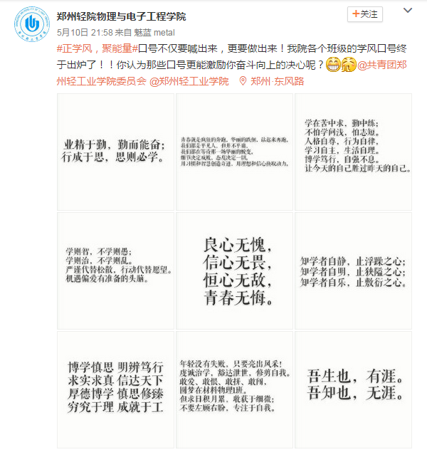 为进一步加强我院学风建设,营造良好的班级学习氛围,激发学生学习的主动性,2016年4月25日—5月8日,物理与电子工程学院开展了“正学风 聚能量”系列活动之班风口号征集活动。