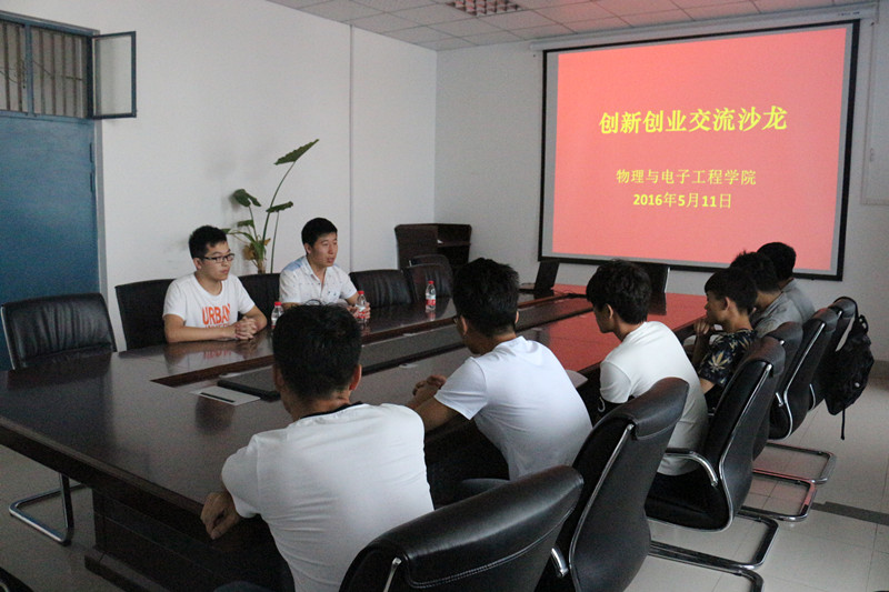 为了进一步提高同学们的创新创业意识和积极性,5月11日中午物理与电子工程学院在东一楼301会议室举行了创新创业交流沙龙。此次活动的主讲人为我院的创新创业典型——12级材料物理的王子冲同学和13级电子科技的李世海同学,我院部分有创业意向的同学参加了此次沙龙。