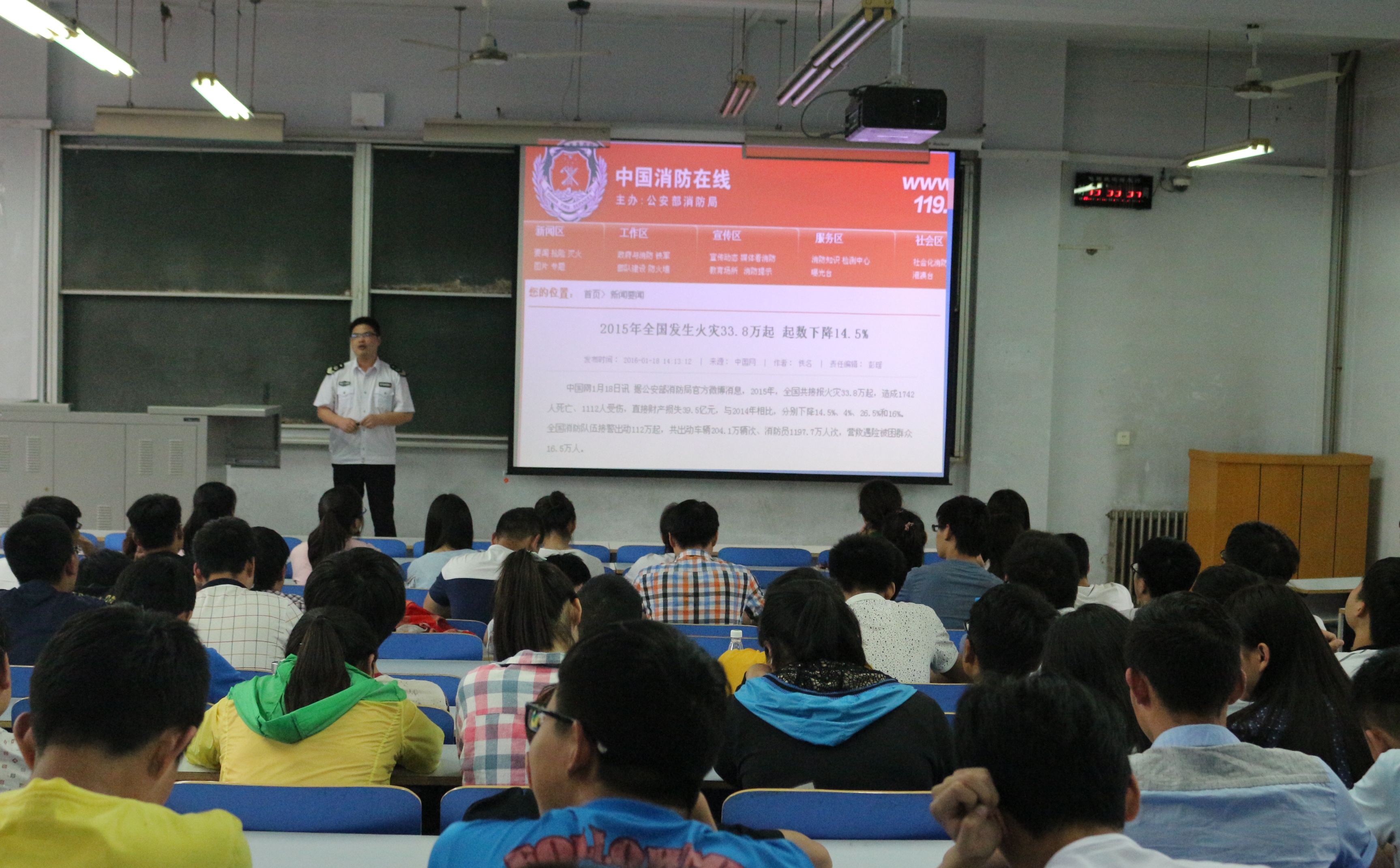 为了普及消防安全知识,增强广大师生的安全意识,5月12日下午,物理与电子工程学院以“关爱生命,远离火灾”为主题的安全消防知识讲座在东一楼318教室举办。本次讲座特别邀请了河南省消防协会(郑州市消防支队)宣讲团的赵强教官给师生们进行讲解。我院党总支书记朱晓东、院长苏玉玲、全体老师及2015级学生参加了本次讲座。