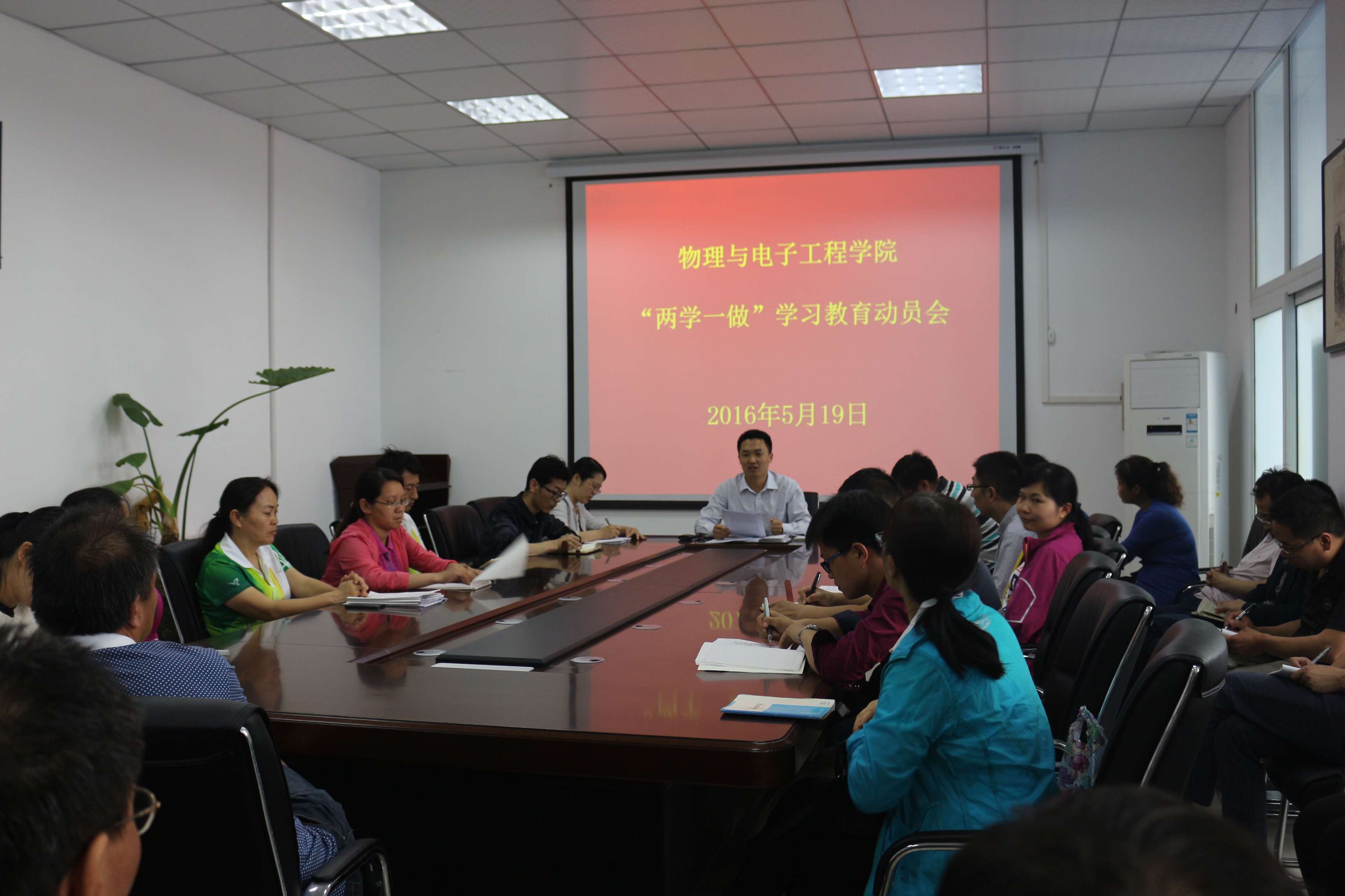 5月19日下午,物理与电子工程学院党总支召开“两学一做”学习教育动员会,安排部署学院“两学一做”学习教育工作。学院中层干部、党支部书记和全体教职工党员参加了会议。会议由党总支书记朱晓东主持。