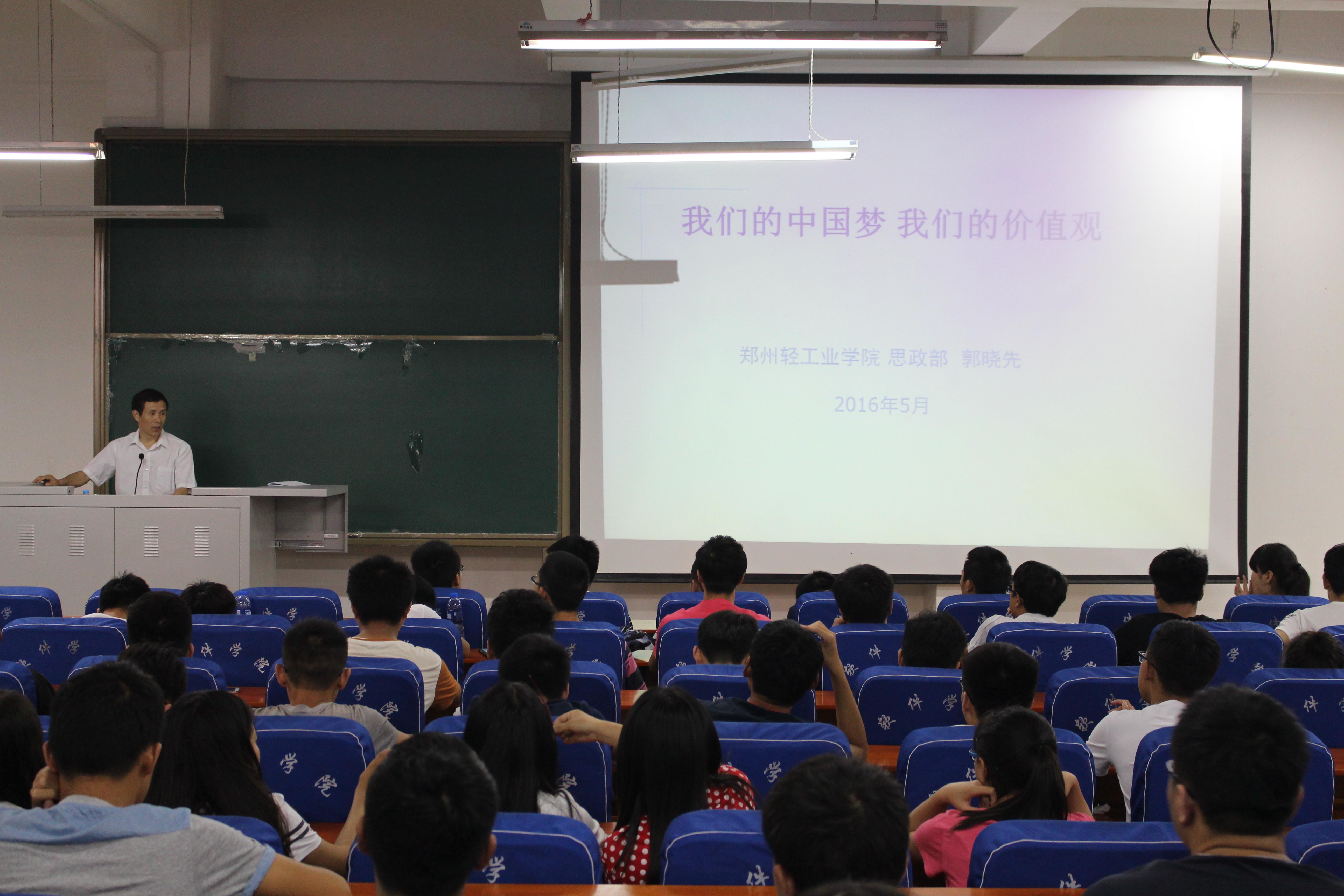 会上,郭晓先老师围绕中国梦、社会主义核心价值观、传统文化道德三方面,详细讲解了习近平总书记对中国梦的阐述,强调了中国梦的“国家富强、民族复兴、人民幸福”三方面内涵和实现中国梦必须坚持的“走中国道路、弘扬中国精神、凝聚中国力量”三个基本原则。他结合党的十八大报告,介绍了中国梦的价值理想内核,分析了中国梦在社会控制、行为规范、利益分配、共识凝聚、理想导向等方面的功能。最后,他从传统文化道德在现实生活中的表现为例,列举了大量的与当代大学生息息相关的生动事例,要求广大同学要将实现中国梦与实现大学梦紧密结合起来,学会做人做事,养成良好的道德习惯,规划好大学生活和职业发展,为实现中国梦而努力。