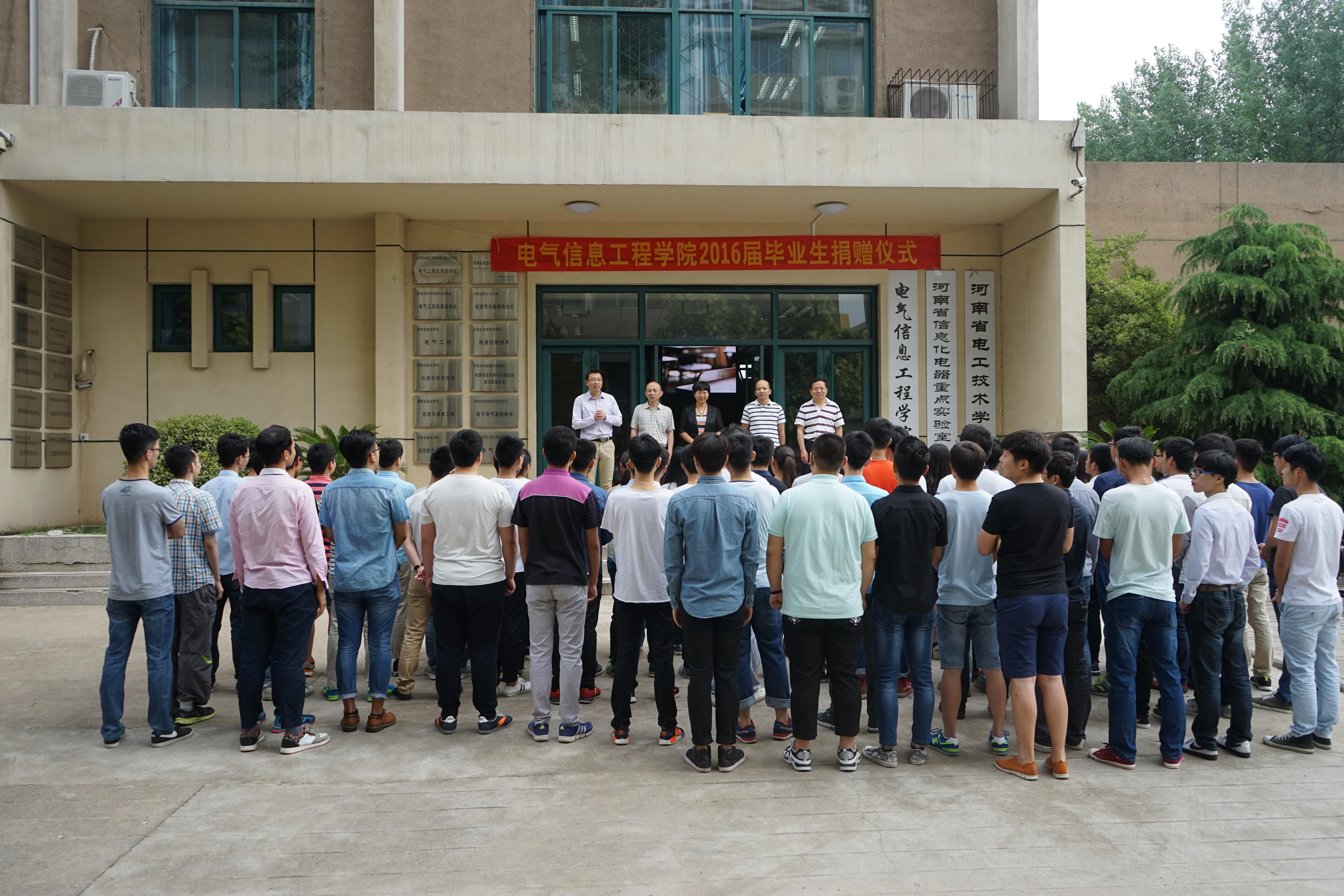 6月1日上午,电气信息工程学院在学院门前广场举行2016届毕业生捐赠仪式。学院党政领导班子,教师代表和2016届毕业生代表参加仪式。仪式由党总支副书记宋文军老师主持。