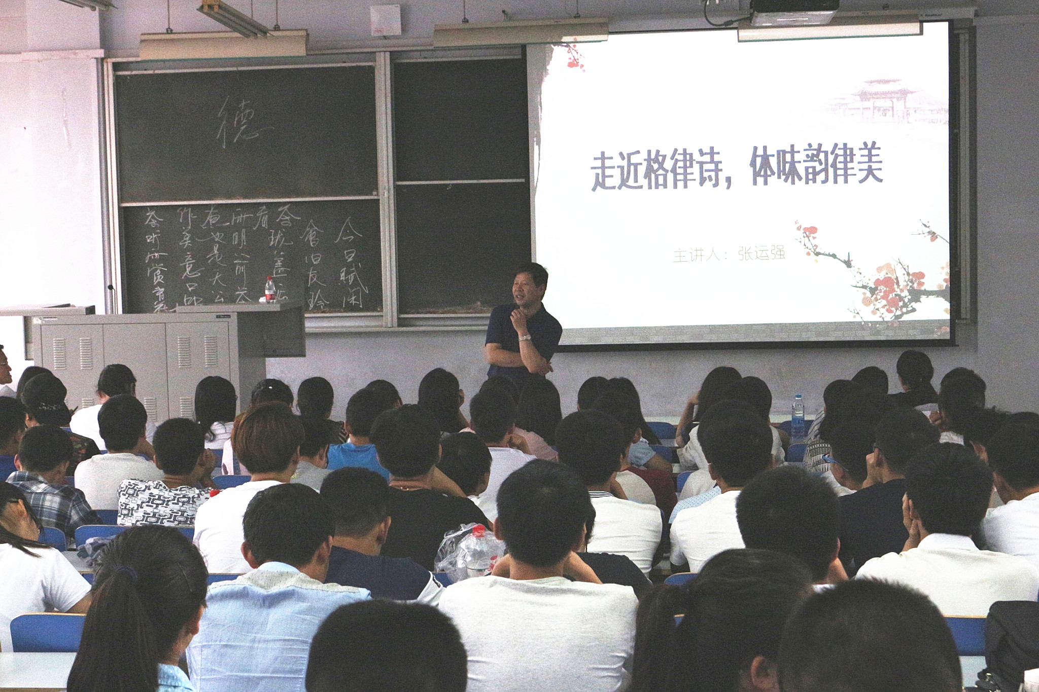 张运强老师以“竹苑仰首吟唐诗,兰庭伏案读汉章”为开篇,引领学生进入了中国诗词的世界,感受了中国格律诗的韵律美。张运强老师通过自己的人生经历向学生诠释了坚持人生梦想的意义,引来了学生阵阵热烈的掌声。最后张运强老师以诗词“青花盖碗”为结尾,告诉学生要心中如一,不忘初衷,要以饱满的热情去体会学习中国的传统文化。