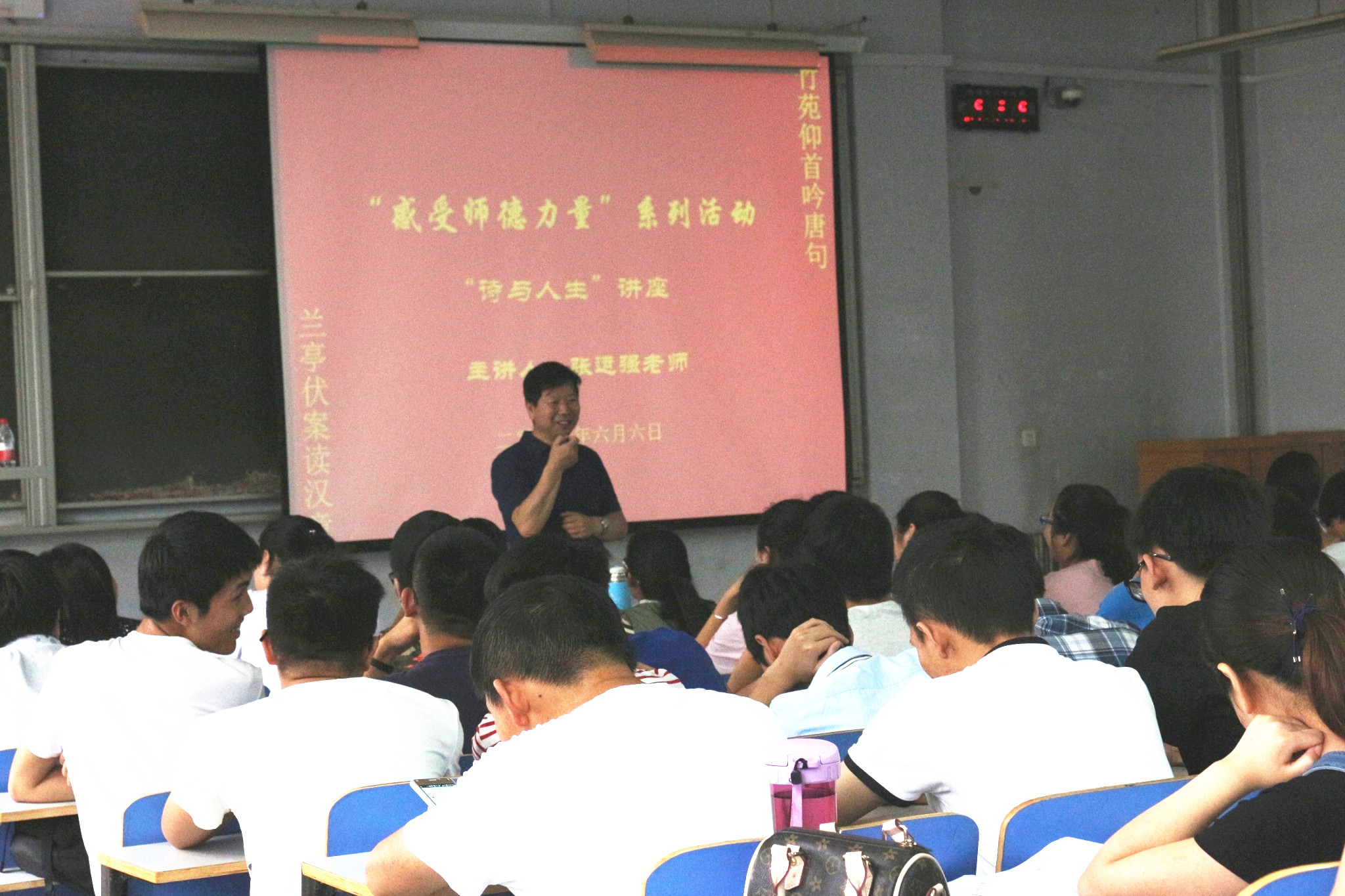 为了提高当代大学生的道德素质,感受师德的力量,物理与电子工程学院于6月6日在东一楼318教室开展了“感受师德的力量”系列活动,邀请了物理与电子工程学院大学物理教研室张运强老师做了“诗与人生”讲座,学院大一大二的同学及部分老师参加了本次活动。