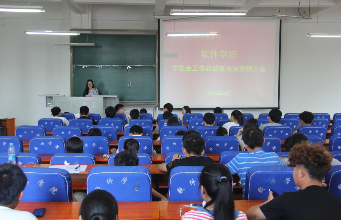 6月16日下午,软件学院分团委、学生会在软件楼219教室成功召开换届竞聘大会。首先,学生会主席杨子恒代表上届学生会进行了工作总结。随后,竞选分团委、学生会各个岗位的25名候选人依次上台,以幻灯片的形式向大家展示了他们在学生工作中的历练、收获与成长,并对未来的工作规划做了详细介绍。最后,分团委书记刘放美老师对学生会一年来的工作做了肯定,对即将成为新一届学生组织骨干的学生干部提出了要求,希望大家牢记为同学服务的宗旨,深入到同学中去,做好沟通学院和学生的纽带和桥梁。