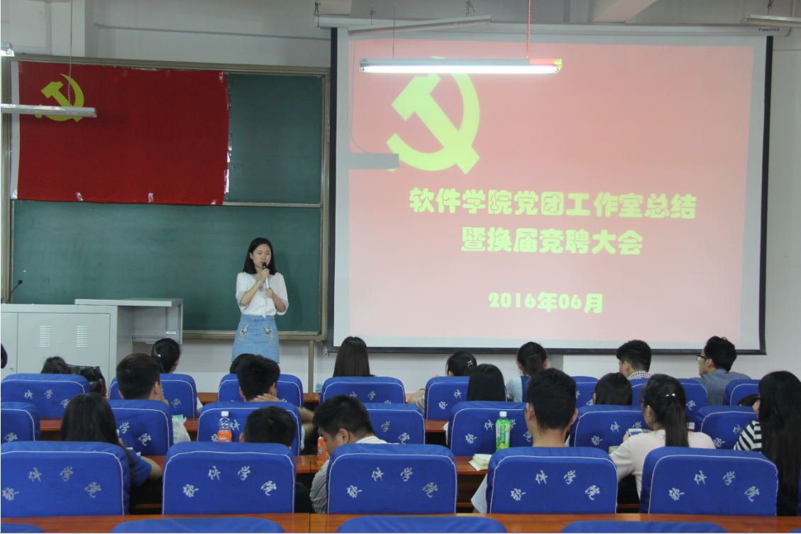 6月14日中午,软件学院党团工作室在软件楼219教室成功召开了换届竞聘大会,参加竞选的同学积极上台讲述竞选理由及工作经验,并针对党团工作提出新思路、新看法。评委们根据各同学的演讲情况提出自己的意见和建议,并对竞选者做了提问,全方位考察他们的能力与素质。