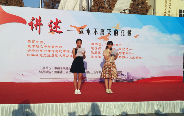 此次活动有中共东风路街道工委主办,外国语学院分团委和河南省工业设计学院协办,旨在以群众喜闻乐见的形式宣传党的丰功伟绩、身边的优秀党员事迹,号召青年学生和社区居民向老一辈共产党员致敬,为迎“七一”暨建党95周年献礼。