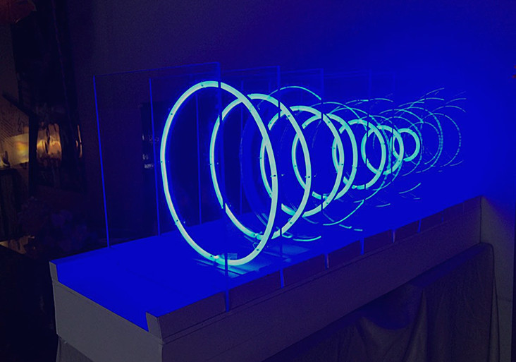 设计理念:运用霓虹灯、亚克力板等材料,采用圆形灯光,通过光线的变迁,丰富空间层次感,以光线来分割视觉空间,