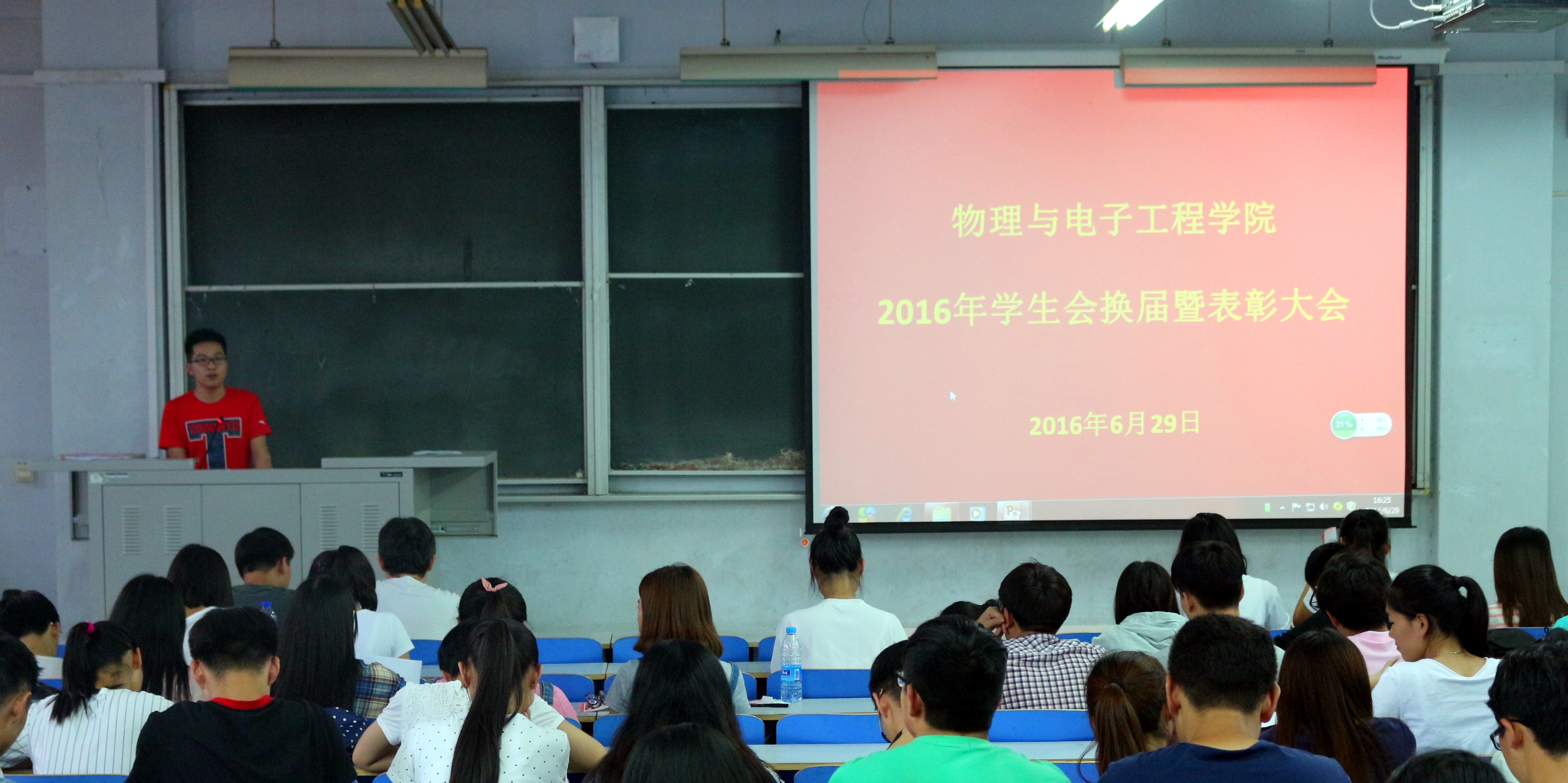 6月29日下午,物理与电子工程学院2016年学生会换届暨表彰大会在东一楼318教室召开。党总支副书记李玲、分团委书记焦云娜、全体学生会干部参加了大会。