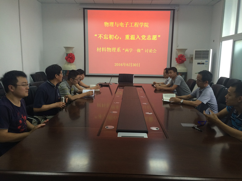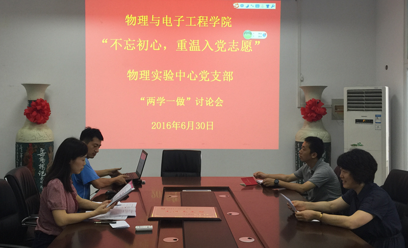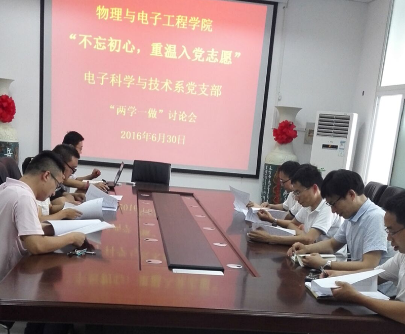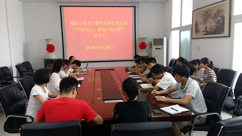 根据学校《关于在“两学一做”学习教育中以“不忘初心,重温入党志愿”为主题开展支部活动的通知》要求,近日,物理与电子工程学院认真开展“不忘初心,重温入党志愿”主题活动,学院46名教工党员、20名学生党员分别在所在支部参加了活动。