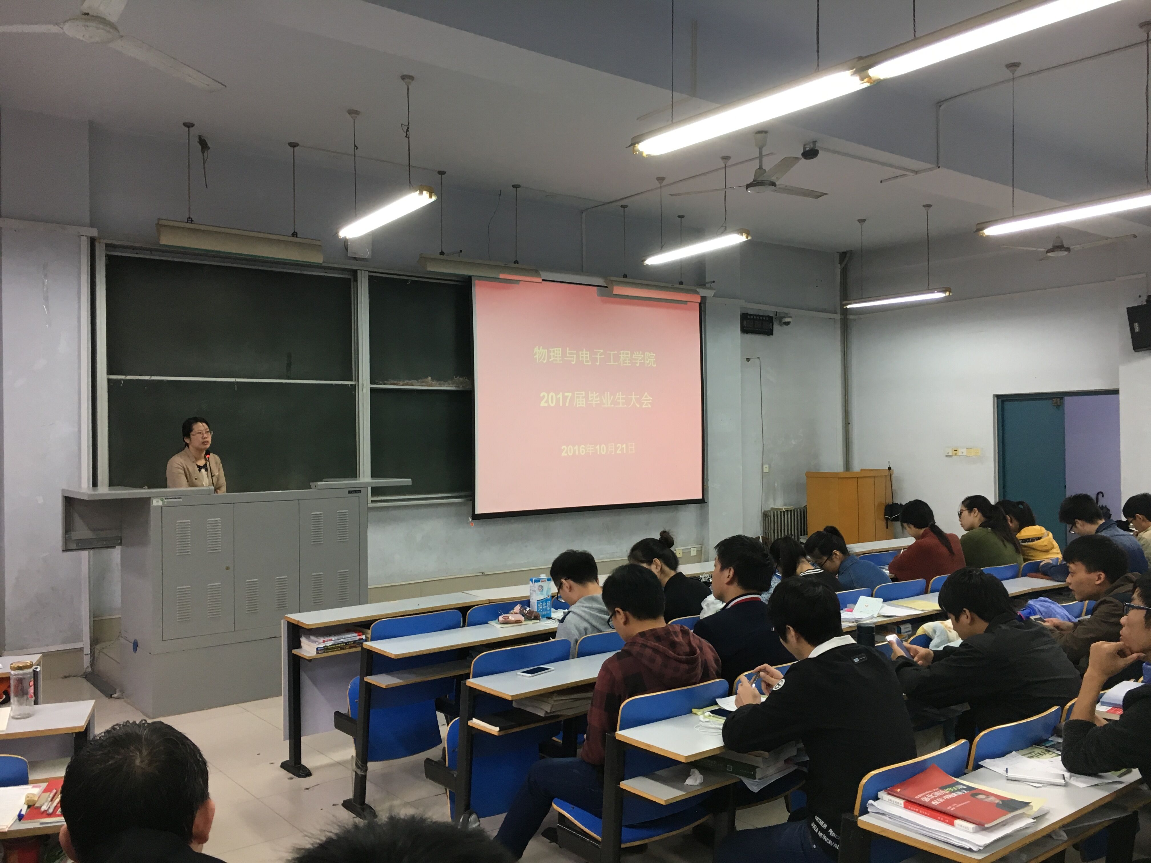为了推动毕业生积极转变就业观念,实现全面就业,10月21日上午,物理与电子工程学院2017届毕业生大会在东一楼318教室召开,党总支副书记李玲、分团委书记焦云娜及全体毕业生参加了大会。