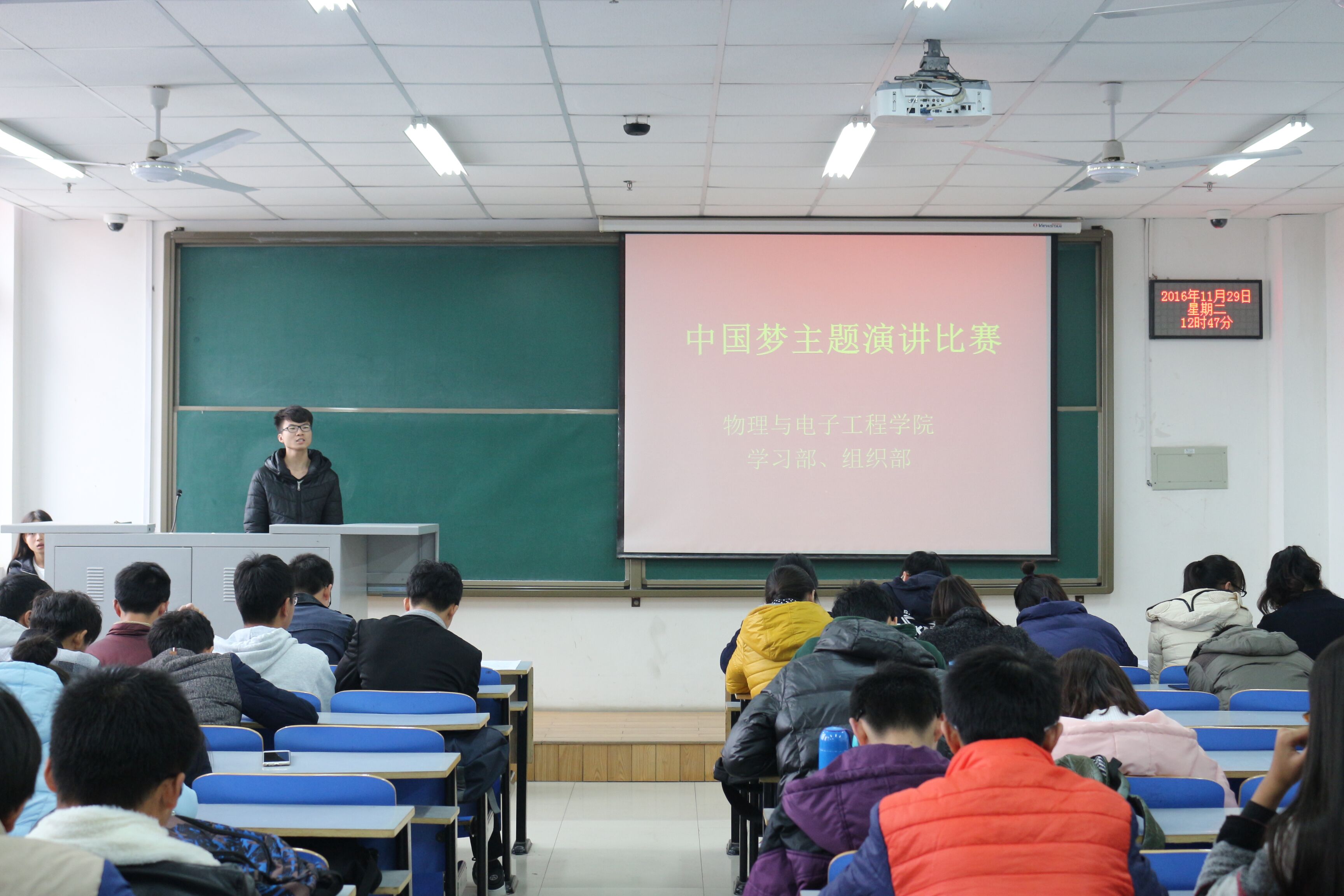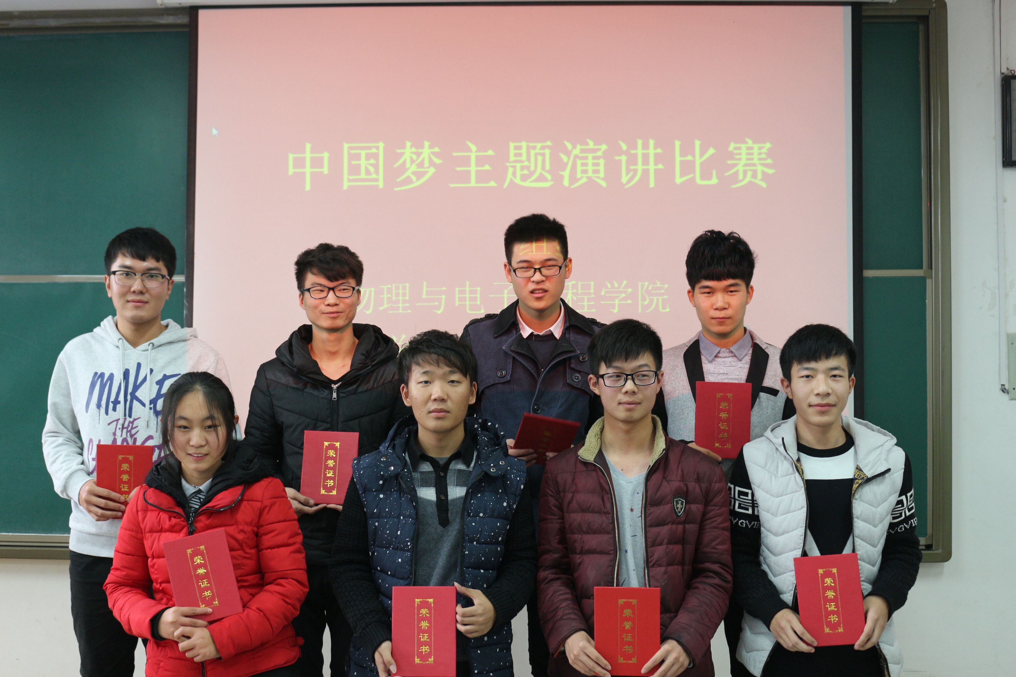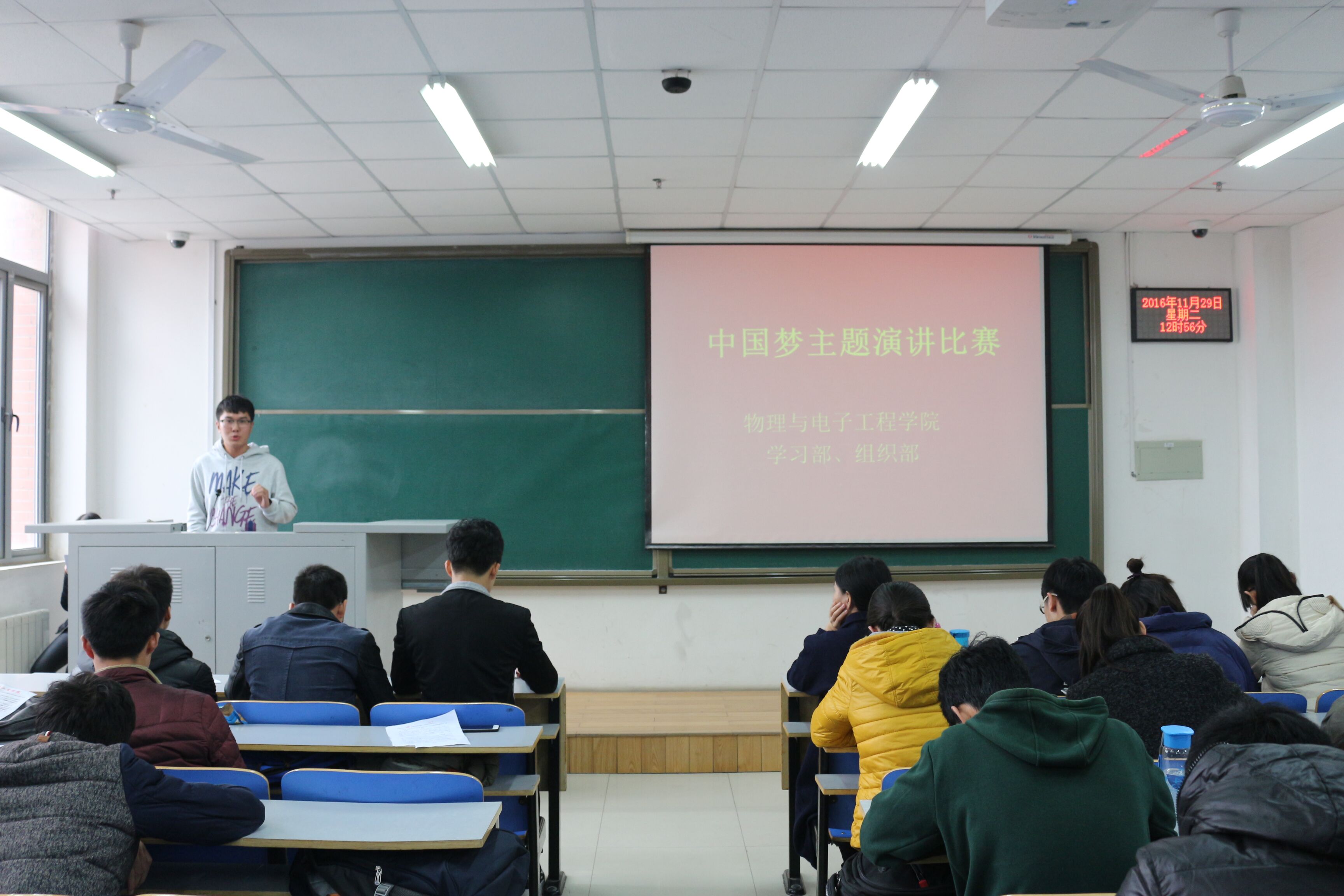为纪念一二·九运动81周年,弘扬爱国主义精神,引领广大青年学生传承红色基因、担当青春使命、立志成才报国,11月29日中午,物理与电子工程学院举办的主题为“中国梦”的演讲比赛在二教楼704教室顺利举行。2016级全体同学参加了本次活动。