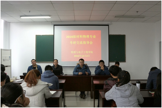 2016年12月2日上午,物理与电子工程学院材料物理系在科学校区四教楼405报告厅组织了专业教师与2014级学生的考研交流指导会,会议由材料物理系主任刘德伟老师主持。