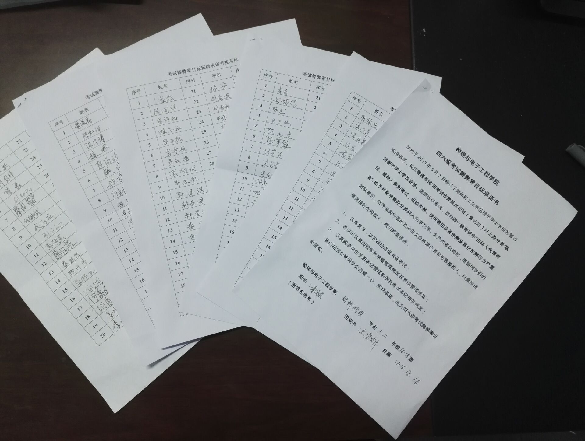 会上,辅导员老师传达了《关于做好近期全国性考试学生诚信教育工作的通知》文件精神,带领同学们认真学习了《中华人民共和国刑法修正案(九)》、《郑州轻工业学院学生违纪处分管理规定》和《郑州轻工业学院授予学士学位的暂行实施细则》(修订)等相关规定,要求同学们充分认识四、六级考试和研究生统一入学考试的权威性和严肃性,以认真的态度对待考试,自觉规范考试行为,诚信考试,杜绝作弊,考出自己的真实水平。会后,各班同学认真填写了四六级考试舞弊零目标承诺书。