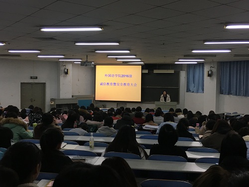 近期,外国语学院各年级分别召开了诚信考试暨安全教育大会,引导广大学生敲响安全警钟,切实排查身边的安全隐患。随后学院还将通过主题班会、安全知识网络学习、新媒体宣传等多种方式来加强寒假安全教育,共同做好安全防范工作。