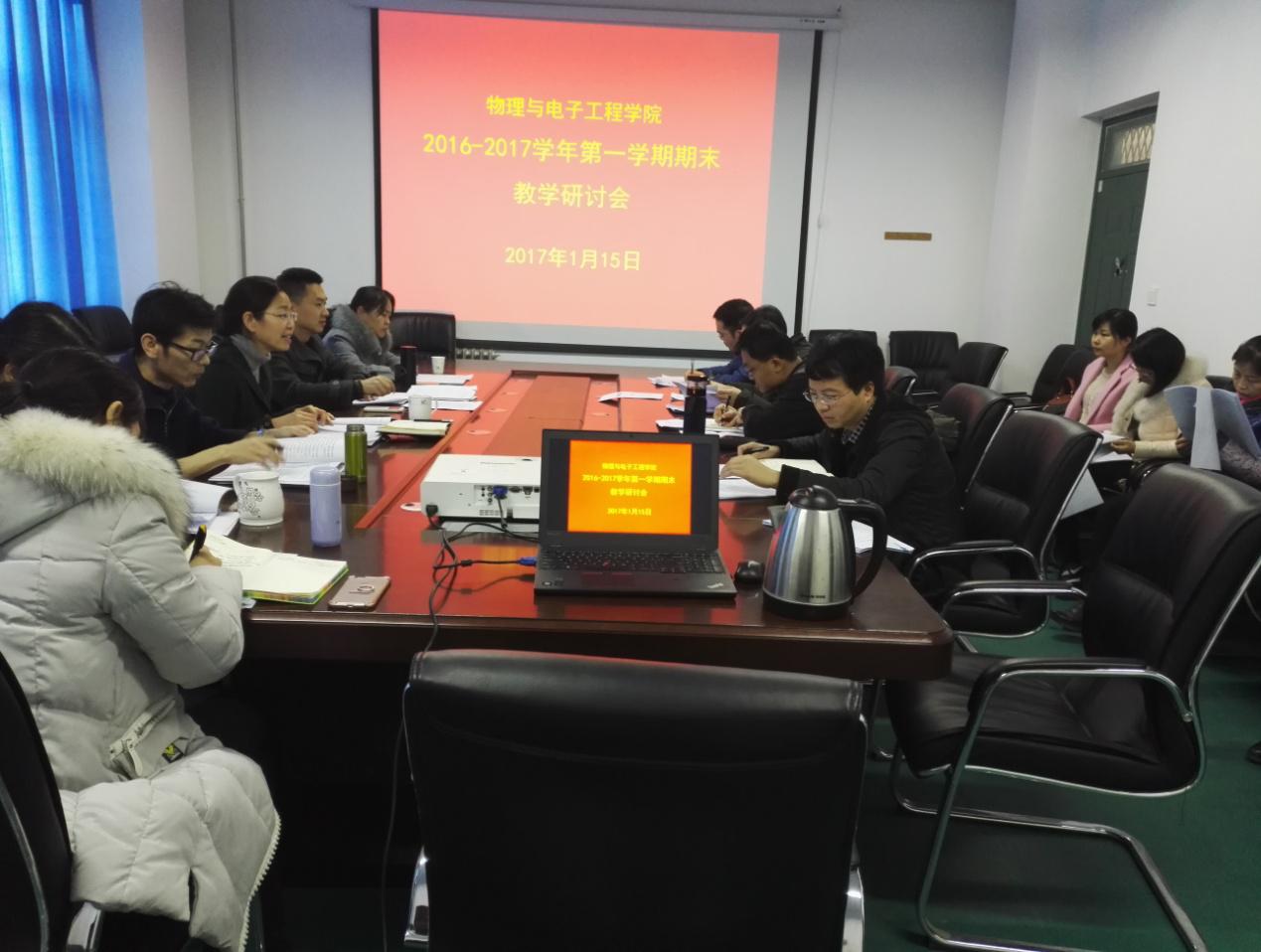 2017年1月15日,物理与电子工程学院在科学校区学生活动中心300会议室召开了期末教学研讨会。物理与电子工程学院全体班子成员、各基层教学单位正副主任、院督导组成员、教学秘书以及辅导员代表参加了会议。会议由院长苏玉玲主持。