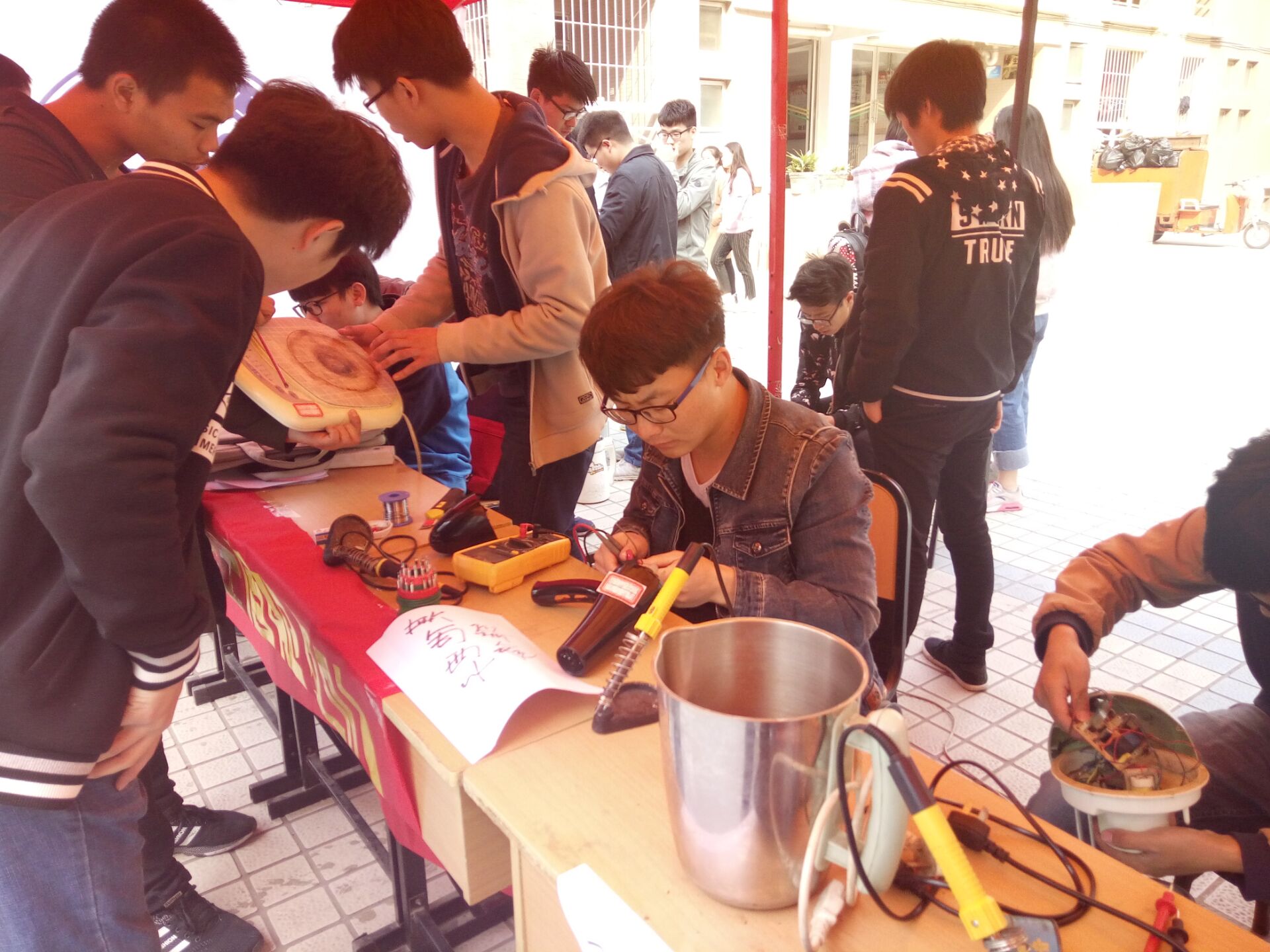 经过前期宣传,3月5日上午8:00,志愿者们在图书馆对面的主干道广场搭起帐篷,开始了为期一天的公益维修。大家对送来的各类家电进行分类、编号,分为三组进行维修,分别负责电脑、热水器和其他类电器。他们熟练地进行检测、拆机、清灰、焊接、更换元器件。截止下午活动结束时,共收到附近居民和学生送来的各类电子产品78件,修复60件。活动中,同学们的专业技能在实践中得到提升、热心助人的精神得到社会的广泛好评,赞赏的话语激励着同学们的热情。