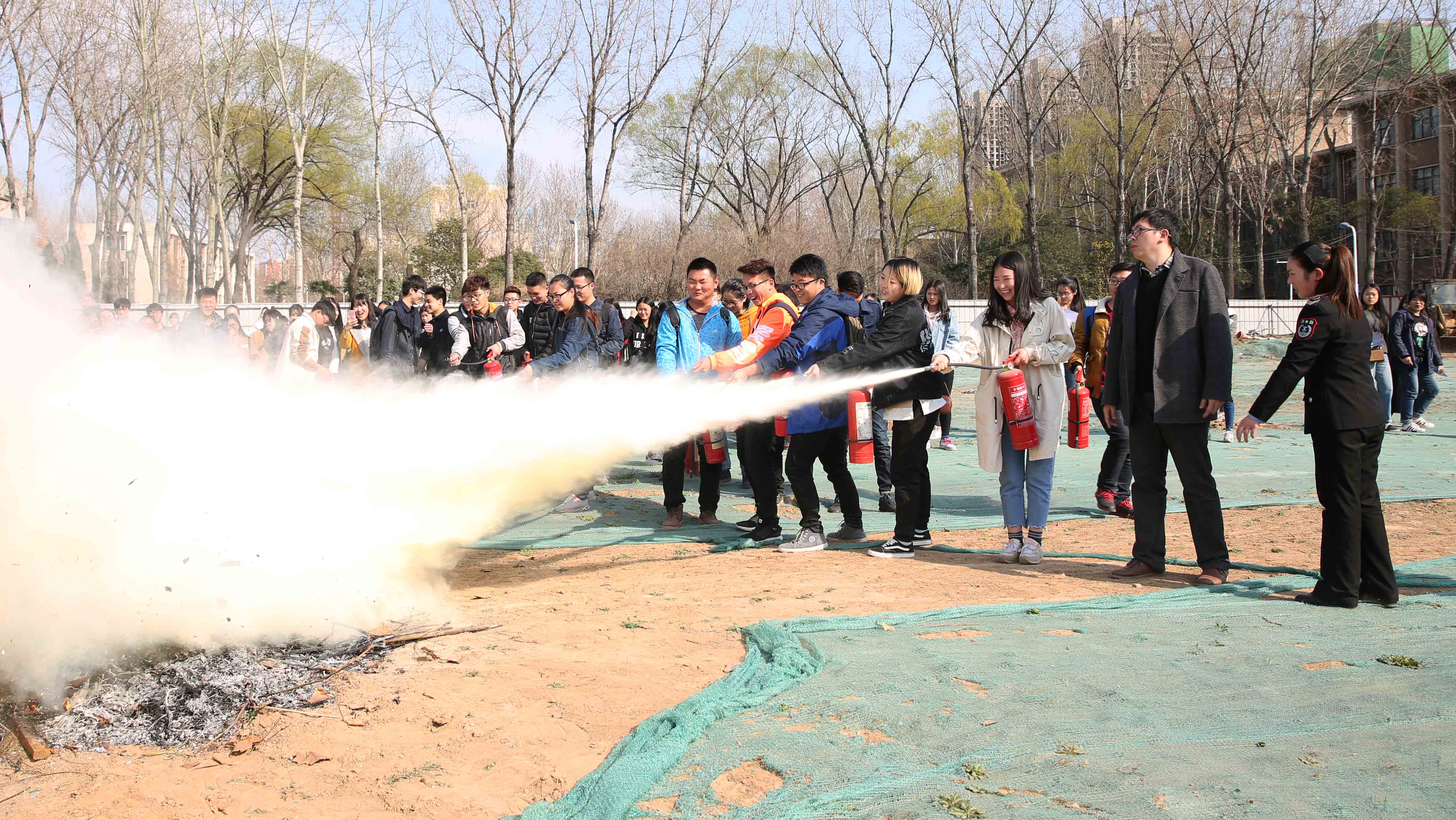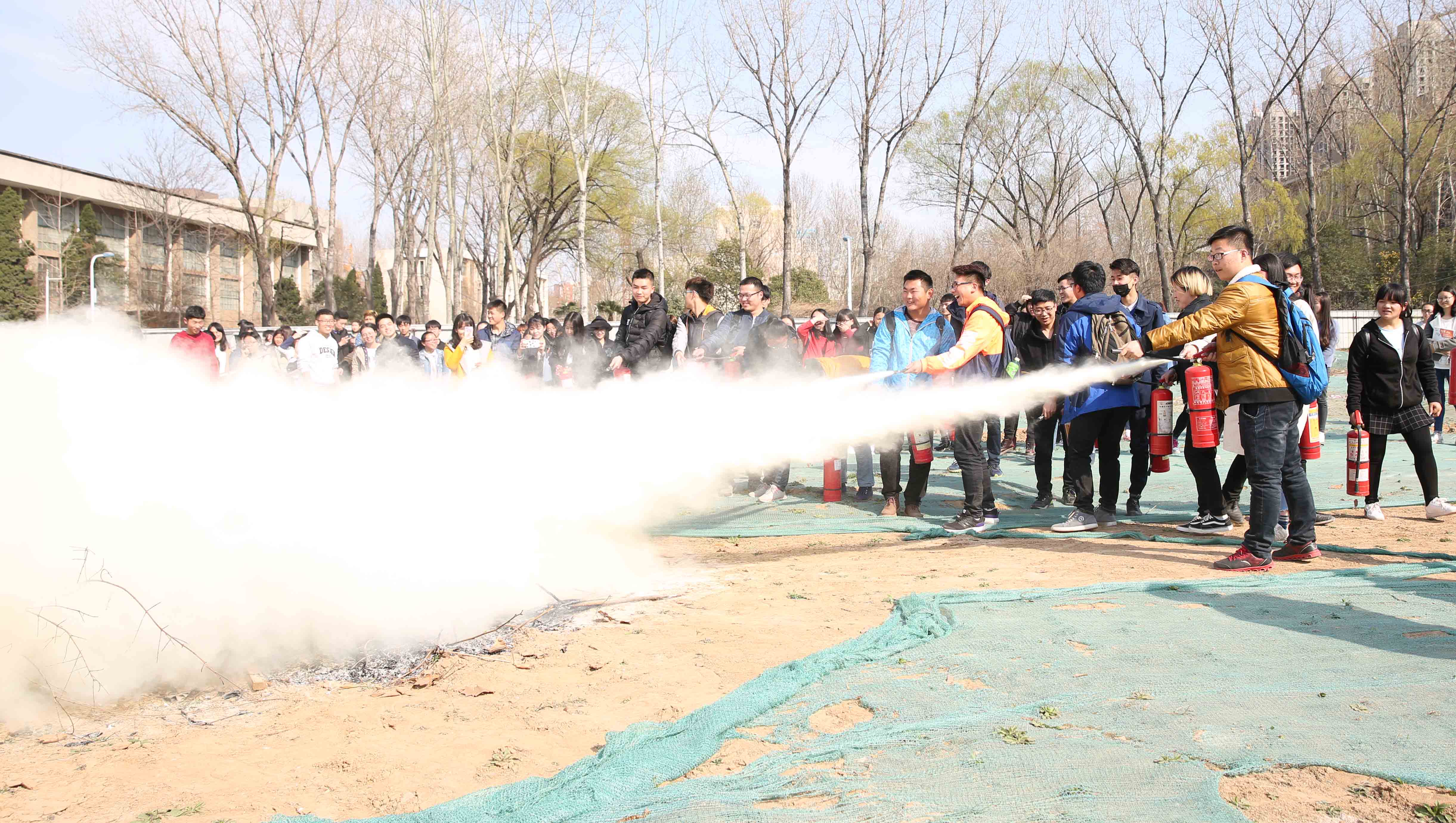讲座结束后,同学们来到体育场南工地进行了灭火器操作实战演练。多数同学都是第一次体验消防器材的实际操作,在靳教官的指导下,大家纷纷拿起灭火器将预先烧起的火堆扑灭。