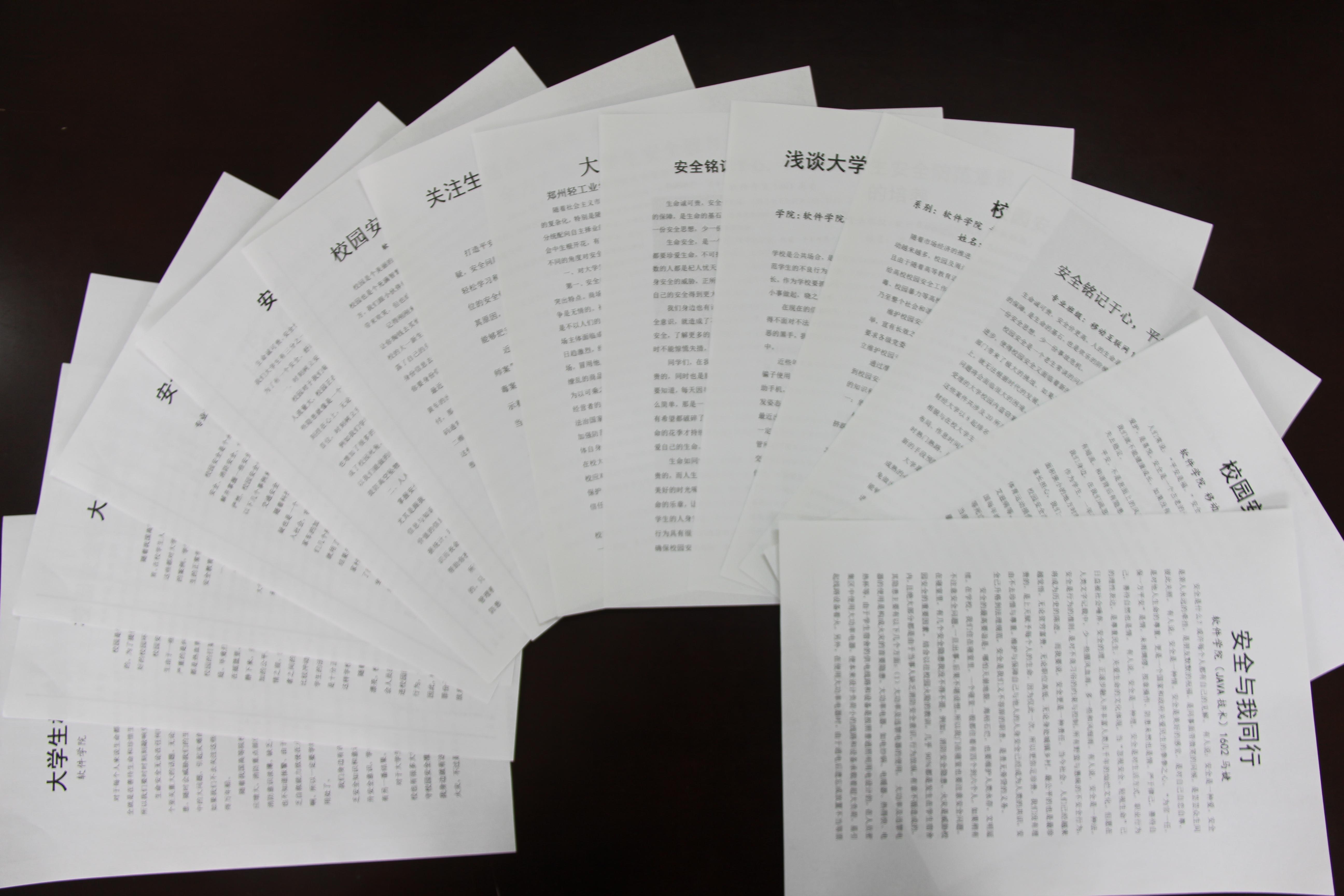 此次征文活动的开展,既给学生提供了一次自我教育的机会,进一步增强学生对安全的理解和把握,也给学生提供了一个展示自我才华的舞台,进一步推进我校平安和谐校园建设。