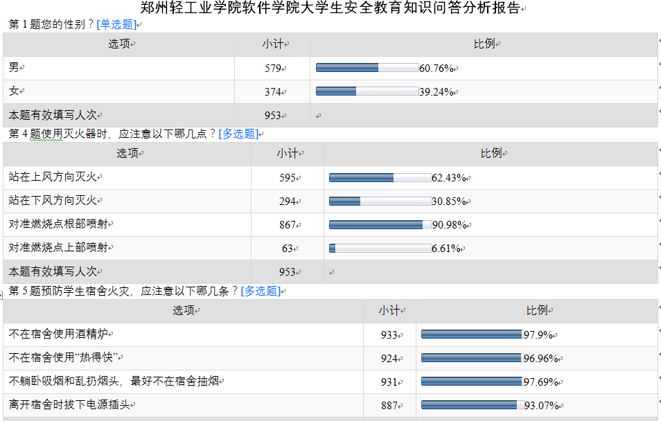 随着“互联网+”时代的到来,新媒体、新技术逐渐成为普及安全知识、提高安全素养的重要手段。我院的安全教育知识网络答题活动采用网络平台,方便快捷,调动了同学们的参与热情,也有利于同学们对安全知识的学习、掌握和运用,对于普及安全知识、提高防范意识发挥了重要作用,成为通过互联网平台开展学生安全教育的有益探索。根据此次统计报告分析,截止到3月31日,我院一共有953人(非毕业生)参与答题。根据答题的调查报告分析,经过一个月的安全知识宣传教育,同学们对常见的安全知识和理论知识掌握较好,但是对于譬如灭火器的使用之类动手知识掌握稍有欠缺,我院今后将多开展相应的活动,让同学们有机会去体验一些安全器材。