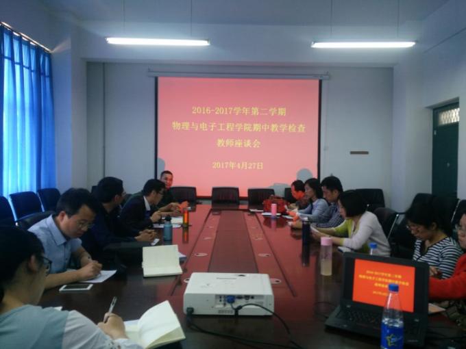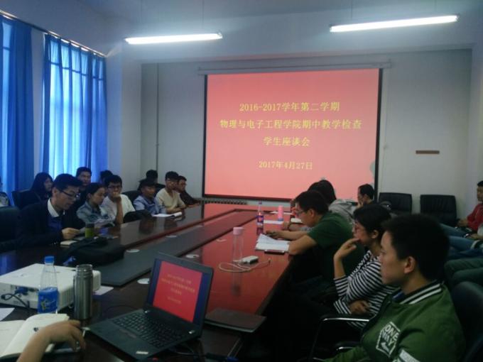 2017年4月27日下午,物理与电子工程学院在科学校区物理与电子工程学院300会议室召开期中教师座谈会和学生代表座谈会,会议由教学副院长王永强主持。