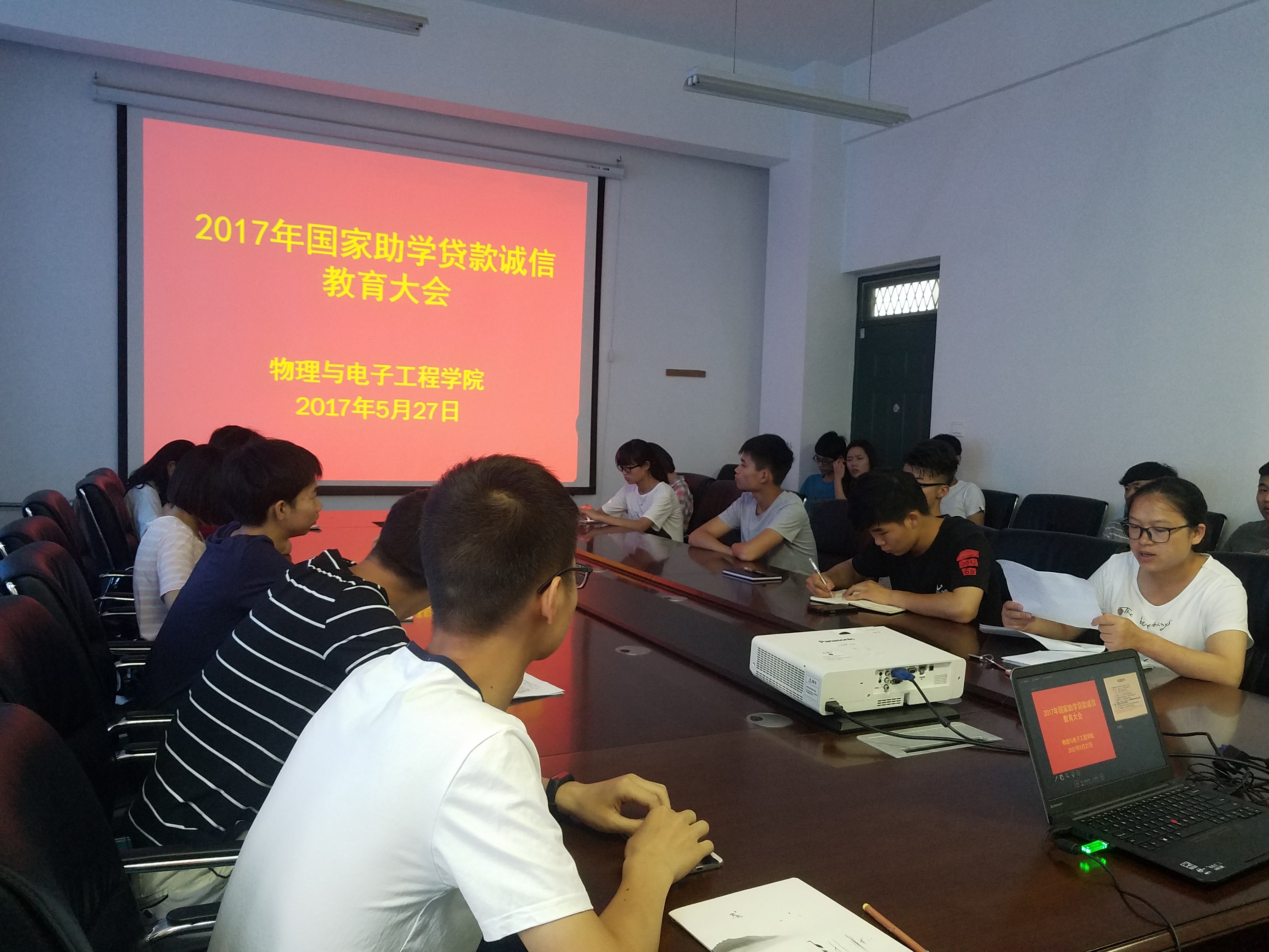 为进一步做好国家助学贷款工作,增强同学们的诚信意识和社会责任感。5月27日中午,物理与电子工程学院在学生活动中心楼300会议室召开了2017年国家助学贷款诚信教育大会,负责贷款的周芳华老师和申请2017年国家助学贷款的20余名同学参加了此次会议。