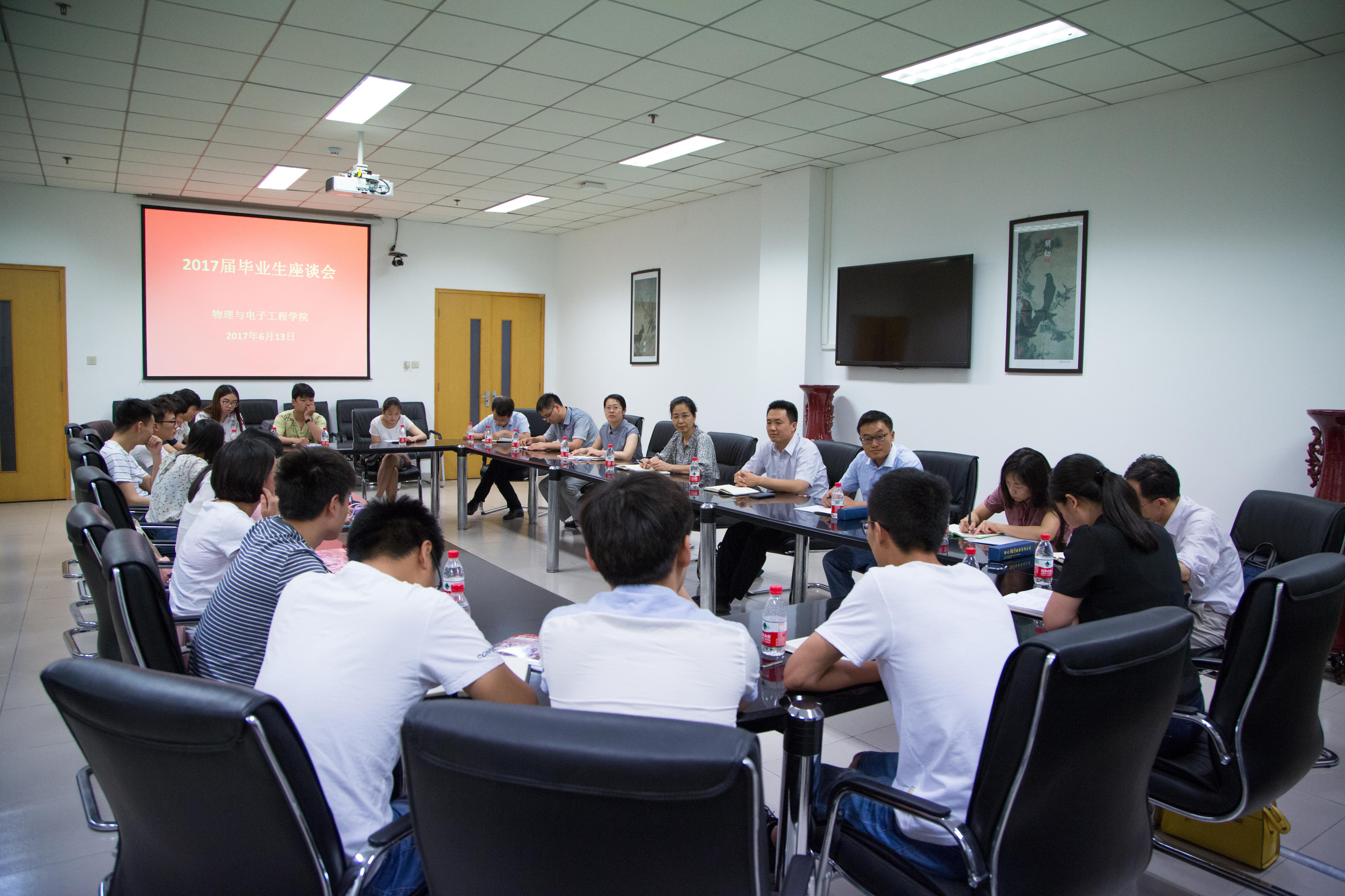 6月13日下午,物理与电子工程学院2017届毕业生座谈会在图书馆第三会议室召开,学院党政领导、教师代表和2017届毕业生代表参加了座谈会。座谈会由党总支副书记李玲主持。