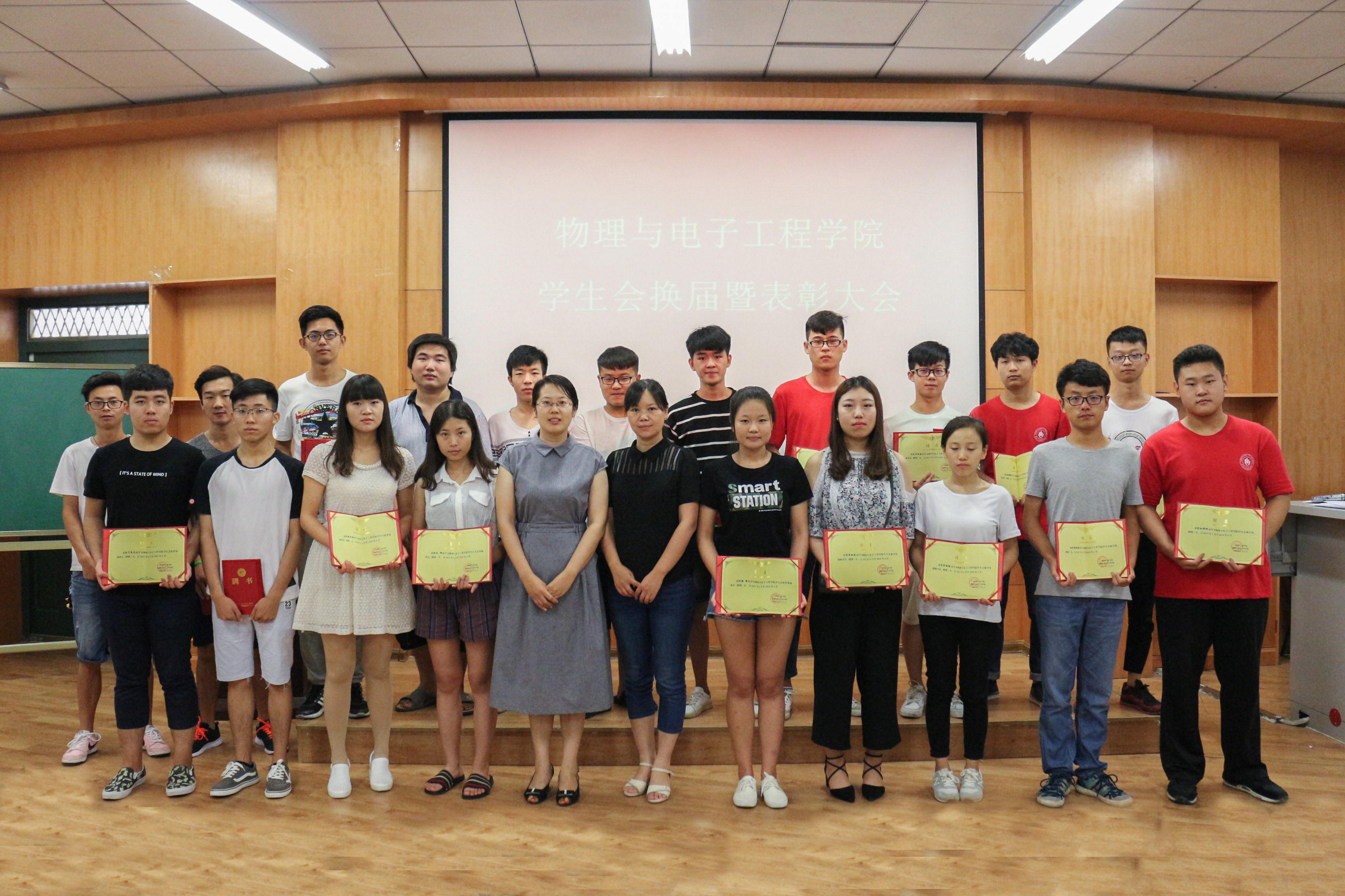6月30日中午,物理与电子工程学院2017年学生会换届暨表彰大会在活动中心113教室召开。党总支副书记李玲、分团委书记焦云娜、全体学生会干部参加了大会。