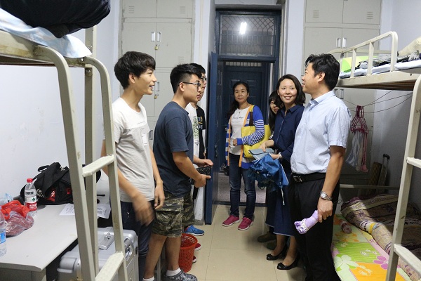 为及时了解新生住宿条件、适应情况及存在的问题,帮助新生尽快实现角色转变,9月9日下午5:00,外国语学院领导班子带领新生辅导员集中走访了新生宿舍,为2017级同学们送去了亲切慰问。