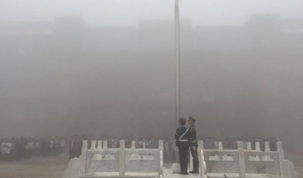 六点四十分,升旗仪式正式开始,学校国旗护卫队迈着铿锵的步伐,护卫着国旗来到广场,全场一片肃静。在激昂的《义勇军进行曲》中,升旗手振臂一挥,鲜艳的五星红旗徐徐展开,在全体师生代表的注目中,迎着初升的太阳,迎风飘扬在广场上空。
