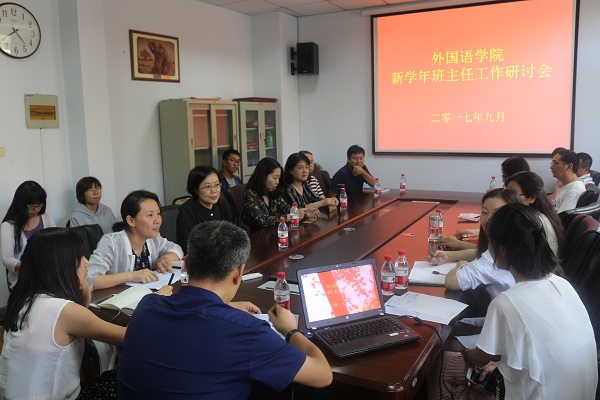 914日下午,外国语学院在东二楼306会议室召开2017年班主任工作研讨会。学院党政领导、全体班主任、辅导员以及各班班长参加研讨。会议由党总支副书记孔祥娟主持。孔祥娟老师宣读了《外国语学院2017-2018学年班主任名单》,并布置期初工作。她希望班主任通过召开期初班会,了解学生动向,及时提出学业警示,指导学生学业发展,引导学生健康生活,助力学生成长成才。同时通报了学院“语言文化月”工作方案,号召同学们全员参与、班主任加强指导,以歌曲、话剧、影视配音等形式加强语言实践锻炼,展现外院学生风采。与会老师与同学们就课程设置、实习实践、压力疏导、学风建设、职业规划、出国交流、考研辅导等问题进行了深入交流和探讨。学生们一致表示,班主任在日常工作中经常牺牲休息时间为学生答疑解惑,谈心谈话,对同学们的学业和人生给予了大力帮助和指导。