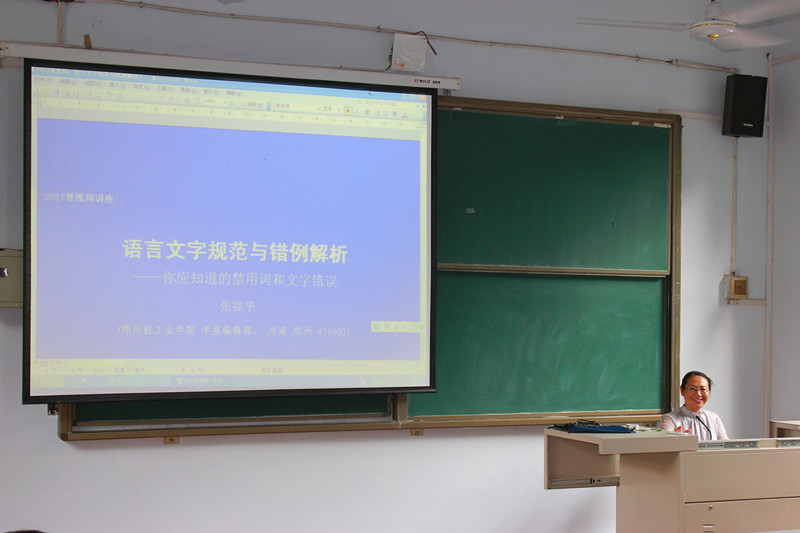 9月21日下午四点,我校学报张福平主编在东二楼100作了题为“语言文字规范与错例解析——你所知道的禁用词和文字错误”的学术报告。这次报告是我校开展的第20届全国推广普通话宣传周活动的一部分。 外国语学院及其他院系的师生参加了此次报告会。