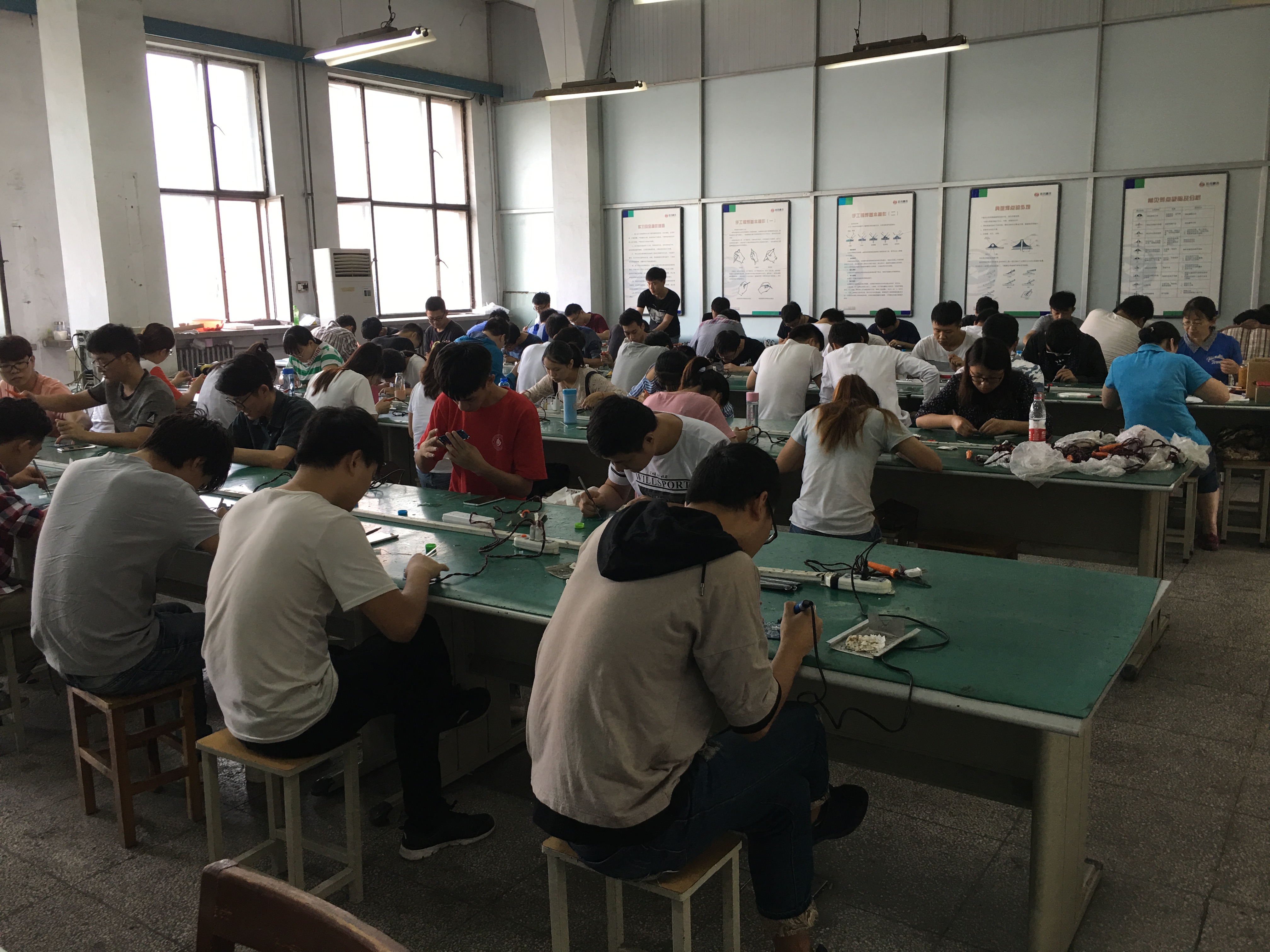 9月18日至9月29日,学生分批次到郑州鼎恒电子科技有限公司与郑州品正科技有限公司进行顶岗实习,实习的主要内容是维修电路板、校准人体秤、人体秤的组装、打包及装箱等,真正参与了产品的各个生产工序,加深了对人体秤、激光美容仪的原理、生产工艺、电路设计及工作过程的理解,感受到企业文化对员工的熏陶。