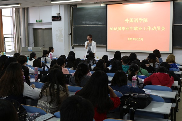 13日下午3点,外国语学院在教三楼104教室召开2018届毕业生就业工作动员会,党总支副书记孔祥娟老师、负责就业老师、毕业班辅导员和全体18届毕业生参加了此次大会。