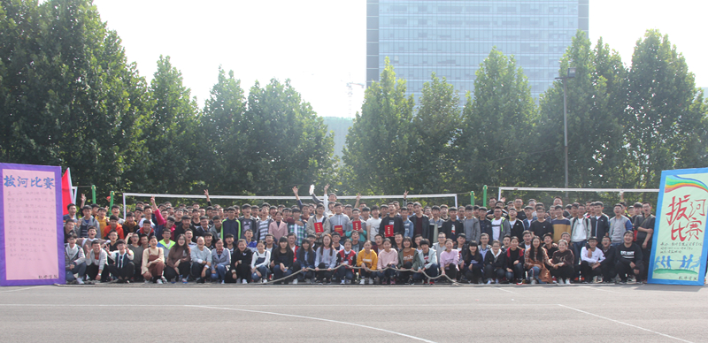中午1时,比赛正式开始。本次比赛以班级为单位派出代表队,每队10男3女共13人参加比赛。参赛队以抽签方式决定双方的比赛对手,采用三局两胜淘汰制分出冠、亚、季军。随着裁判一声哨响,全场顿时沸腾起来,参赛同学们个个卯足了劲,使出了浑身的力气,攥着手腕粗的拔河绳用力向后拉,绳子顿时紧绷,双方时常出现势均力敌、胜负难分的局面。赛场边,观众们也不甘示弱,随着参赛同学身体倾斜的方向,有节奏地挥动着双臂,一同喊着响亮而有节奏的口号,给参赛同学鼓励,呐喊声、加油声、助威声此起彼伏,热烈的竞赛氛围一浪胜过一浪。比赛结束后,辅导员和全体新生一起合影留念。