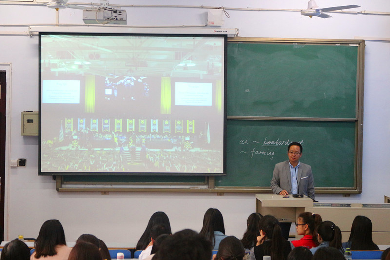 聂韶峰老师结合自己在美国奥克兰大学的访学经历,通过大量图文材料介绍了美国的校园文化、汽车文化、饮食文化、生态文化、节日文化和体育文化,将美国社会、语言和文化信息融入到具体生动的鲜活事例之中。聂老师在讲座中多次比较了中美文化差异,并阐明了其内在原因。讲座内容新鲜,材料详实,趣味性强,赢得了在场学生的阵阵掌声。
