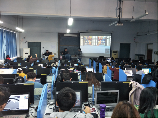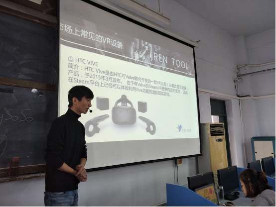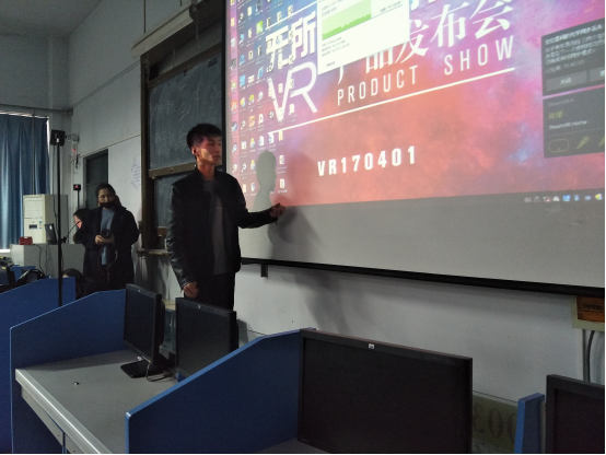 讲座中,曹飞首先讲解了虚拟现实的概念、操作平台的应用、当下主要的虚拟现实设备与产品等,介绍了国内当下虚拟现实、增强现实发展产业等方面的发展情况,让同学们对虚拟现实有初步了解。随后,曹飞展示了时下流行的虚拟现实游戏,并通过让学生尝试VR/AR游戏的现场真实体验,进行了现场教学,让大家零距离接触虚拟现实,真实感受虚拟现实技术与艺术带来的视觉冲击力,激发同学们对虚拟现实的兴趣。最后曹飞引入本公司的商业项目“虚拟现实博物馆”和“移动端游戏”,通过对这两个经典案例的前期调查研究、概念设计,到中期的虚拟平台搭建、后台技术实现,再到后期的产品发布、网络运行与维护、大数据、市场发售与服务等,做了系统、详细的介绍,让同学们对当下的虚拟现实产业链、软件开发环境、事软件开发技术工作、互联网产业等,有了深刻的理解,实现了和企业的零距离接轨。