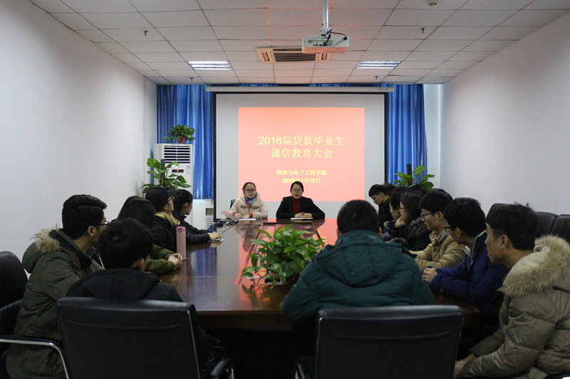 为进一步增强贷款毕业生诚信意识,明确贷款还款程序,1月15日上午物理与电子工程学院在四教楼503会议室举行了2018届贷款毕业生诚信教育大会。会议由负责贷款的周芳华老师主持,学院党总支副书记李玲老师以及我院22名2018届贷款毕业生参加了此次会议。