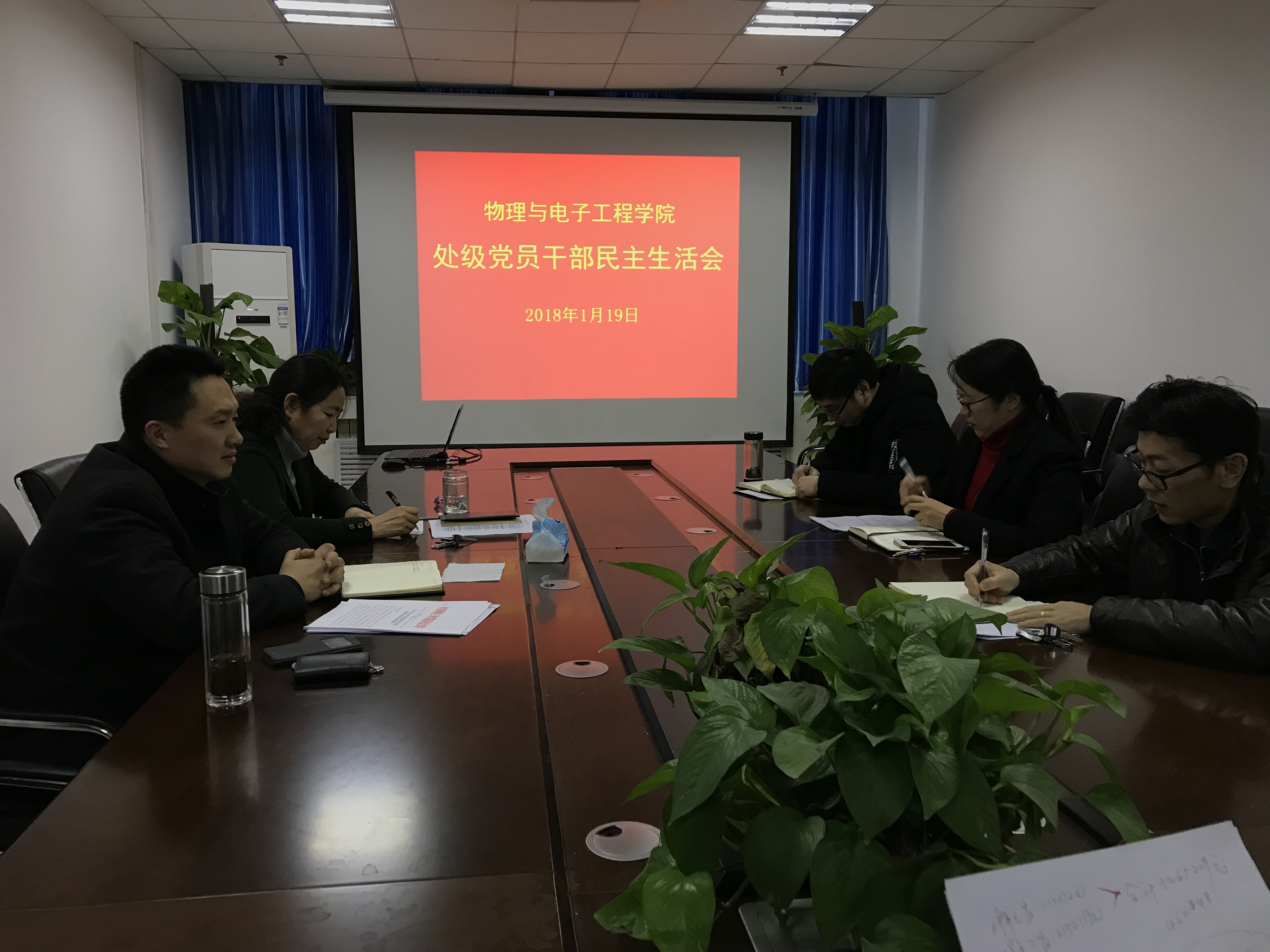 按照校党委《关于认真开好2017年度处级党员领导干部民主生活会的通知》要求,2018年1月19日下午,物理与电子工程学院在科学校区四教楼会议室召开民主生活会。物理与电子工程学院领导班子全体成员参加会议。会议由党总支书记朱晓东主持。