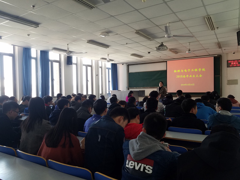 为了进一步帮助毕业生转变就业观念,引导毕业生积极就业,3月16日上午物理与电子工程学院2018届毕业生大会在二教楼704教室召开。学院党总支副书记李玲、辅导员老师及2018届全体毕业生参加了会议。
