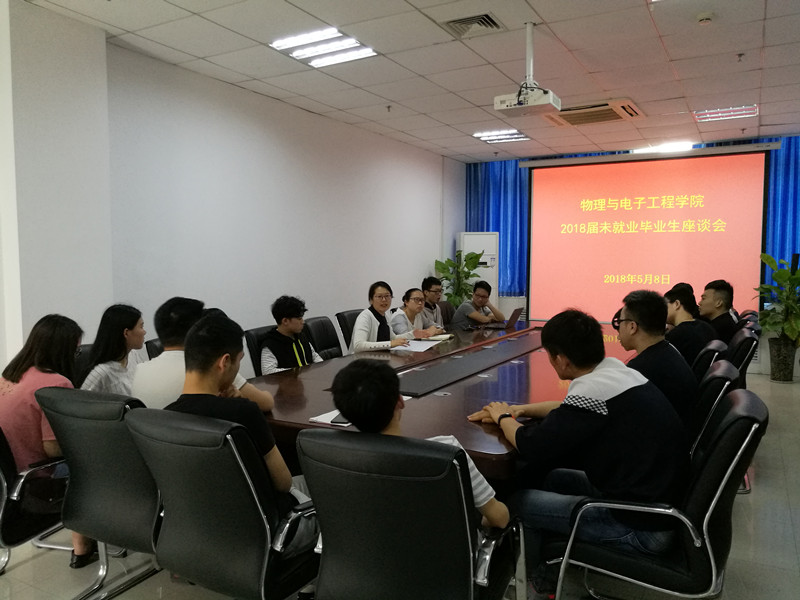 为全面掌握未就业学生状况,调整未就业同学心态,切实做好2018届毕业生就业工作,5月8日中午,物理与电子工程学院在四教楼503会议室召开了2018届未就业毕业生座谈会。学院党总支副书记李玲、学工办周芳华老师及部分未就业毕业生参加了会议。