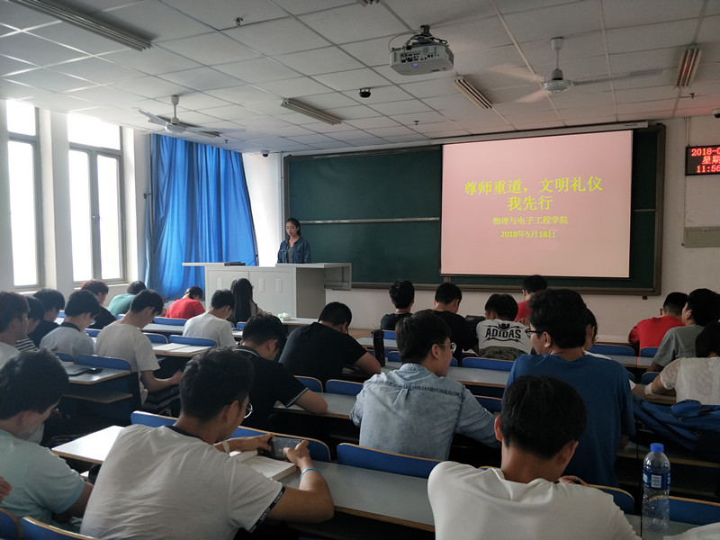为提升我院学生的文明礼仪素养,提高我院学生道德品质和公德意识,积极构建和谐文明校园。5月18日下午,物理与电子工程学院在二教楼704开展以“尊师重道,文明礼仪我先行”为主题的文明礼仪养成教育活动,我院100余名学生参加了此次活动。