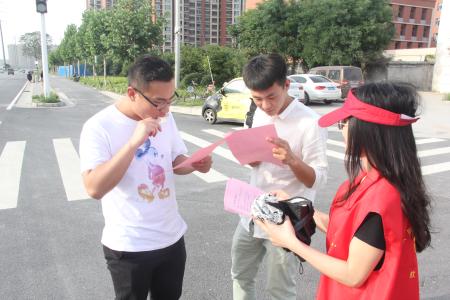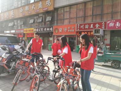 在路口,志愿者首先分成两个小分队。一个小分队成员头戴小红帽,身穿志愿服务红马夹,在红绿灯口有序的指导行人在人行道文明有序通行,纠正不文明交通行为,帮助行人正常地通行的同时做到不拥挤不混乱。另一个小分队成员则整理摆放在路旁的共享单车,将共享单车放到指定的停放位置,并将倒在地上的车子扶起以至于不会影响到附近的居民或者同学们正常使用共享单车。在活动开展的同时,志愿者还给路旁的行人发放《文明安全出行》宣传页,宣传普及交通法规常识,讲解文明出行的重要性,帮助大家树立交通安全意识。