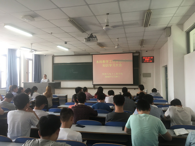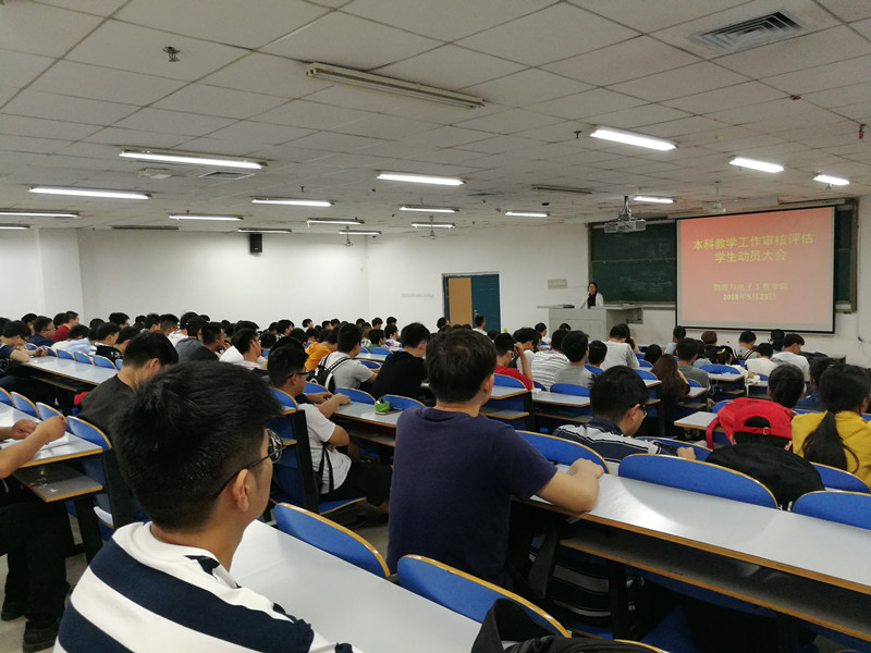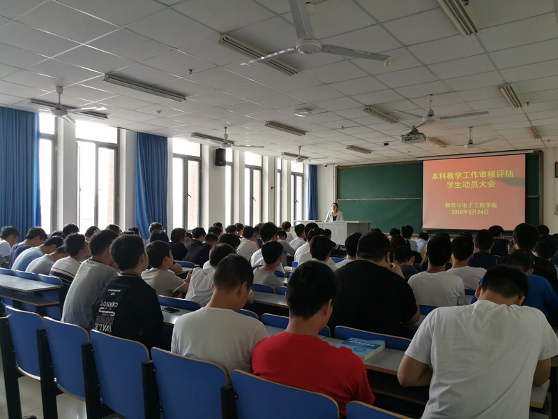 为确保本科教学审核评估工作的顺利开展,督促同学们掌握本科教学工作审核评估的基本知识。5月22日至31日,物理与电子工程学院面向全体学生开展了本科教学工作审核评估动员系列会议。学院党总支副书记李玲老师、辅导员周芳华老师、张瑞亮老师及全体本科生参加了大会。