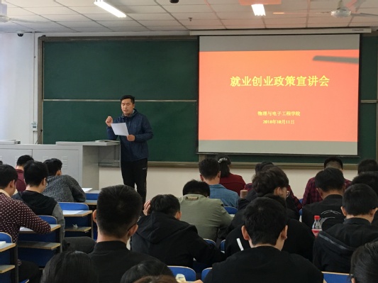 中午,物理与电子工程学院在二教楼704教室召开了毕业生就业工作会暨就业创业政策宣讲会,学院党总支副书记李玲、就业工作负责老师王冠玺、2015级全体本科生参加了会议。