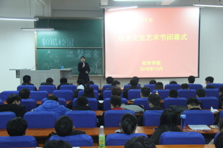 12月20日晚,软件学院在软件楼219室成功举办2018年宿舍文化艺术节闭幕式暨颁奖仪式,为期一个月的宿舍文化艺术节顺利闭幕。软件学院分团委书记刘放美、学工办主任李辉和各班级学生代表参加了活动。