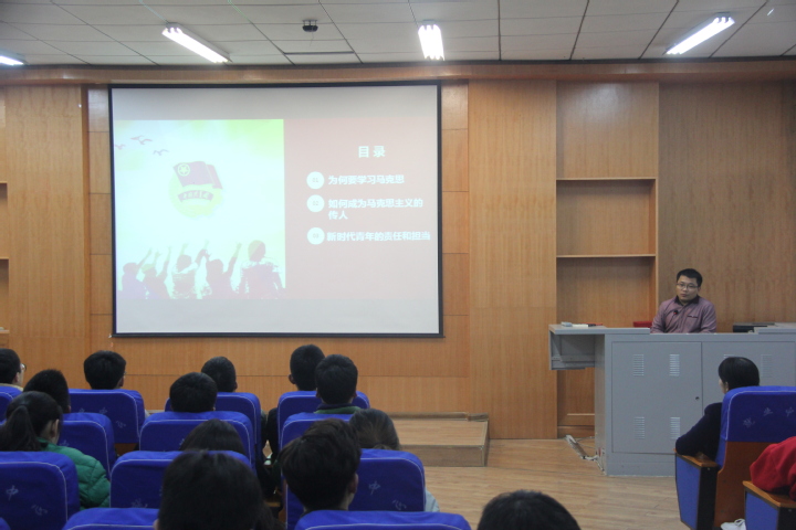 聂海杰博士首先用“你和马克思熟吗?”和“你对‘老马’的印象是?”两个话题与同学们展开讨论,引发大家对马克思主义的进一步思考。接着,他围绕“新时代青春的正确打开方式”这一主题,分别从“我们为什么要向马克思学习?”、“如何成为马克思主义的传人”、“新时代青年的责任和担当”三个方面和大家分享了青年学生如何学习和实践马克思主义。他指出,作为新时代的新青年,要力争成为新时代中国的青年马克思主义者,站位高远,将“学习马克思主义”提升到为国家和人民谋福利的高度上来,将马克思主义经典学习中领悟到的“原理”运用于我们的学习、工作和生活。最后,他用马克思主义的职业观寄语青年学生们,只有大家全都“撸起袖子加油干”,中华民族伟大复兴的中国梦和中国特色社会主义“强起来”的战略目标,才能圆满实现。希望同学们悟大道、立大志、成大业,用青春奋斗谱写新时代的乐章,用奋斗青春铸就新时代的辉煌!