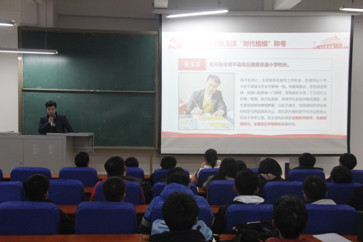 会上,全体学生一起观看了《时代楷模——大山深处的教育播火人张玉滚》视频,学习张玉滚同志的先进事迹。通过学习,大家了解了现任镇平县高丘镇黑虎庙小学校长的张玉滚同志,2001年9月从南阳第二师范学校毕业后,回到家乡黑虎庙小学任教,17年的艰苦磨练,练就了张玉滚过硬的技能:手执教鞭能上课,拿起勺子能做饭,握起剪刀能裁缝,打开药箱能治病。他用17年如一日的坚守,照亮了山区农村孩子的求学之路,也照亮了每一个人的心灵之路。他用高尚的品格诠释了新时期师德的内涵,展现了新时期人民教师的光辉形象。学习完张玉滚同志的先进事迹后,同学们结合自己的学习、工作、生活积极讨论,发表自己的想法。大家纷纷表示在日后的学习工作中要以张玉滚同志为榜样,学习他对党忠诚、无怨无悔的坚定理想信念;学习他吃苦耐劳、不畏艰险的顽强奋斗精神;学习他爱岗敬业、勇挑重担的强烈责任担当。